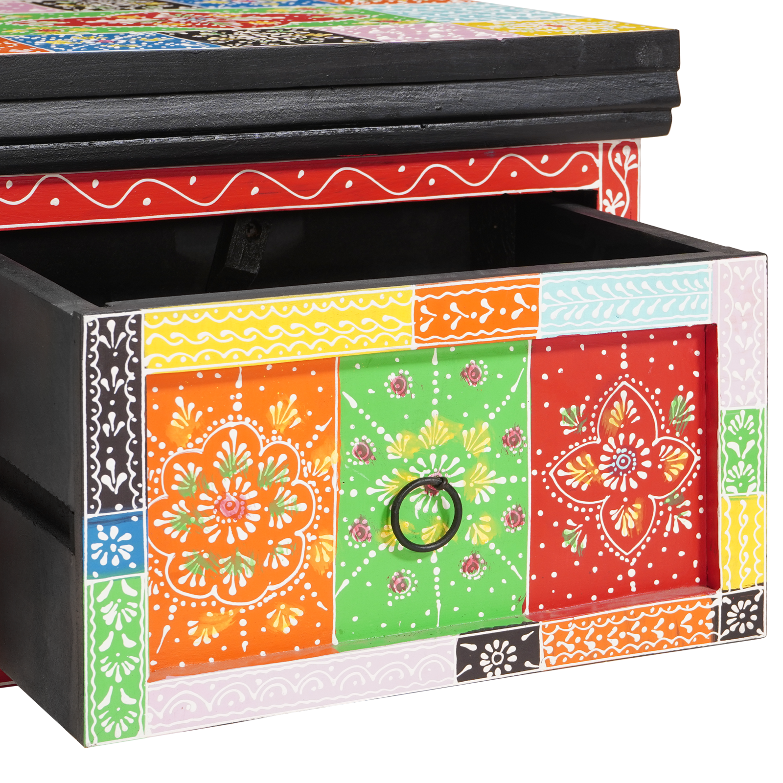 Tento bohémský noční stolek s lehkostí spojuje živý styl s praktickými funkcemi. Díky hravé směsici textur, vzorů a výrazných barev dál vylepšuje každou ložnici. Je ideální pro ty, kteří hledají svobodný design a efektní organizaci. Ať už chcete oživit svůj pokoj nebo potřebujete více úložného prostoru, stůl zajišťuje styl a funkčnost.