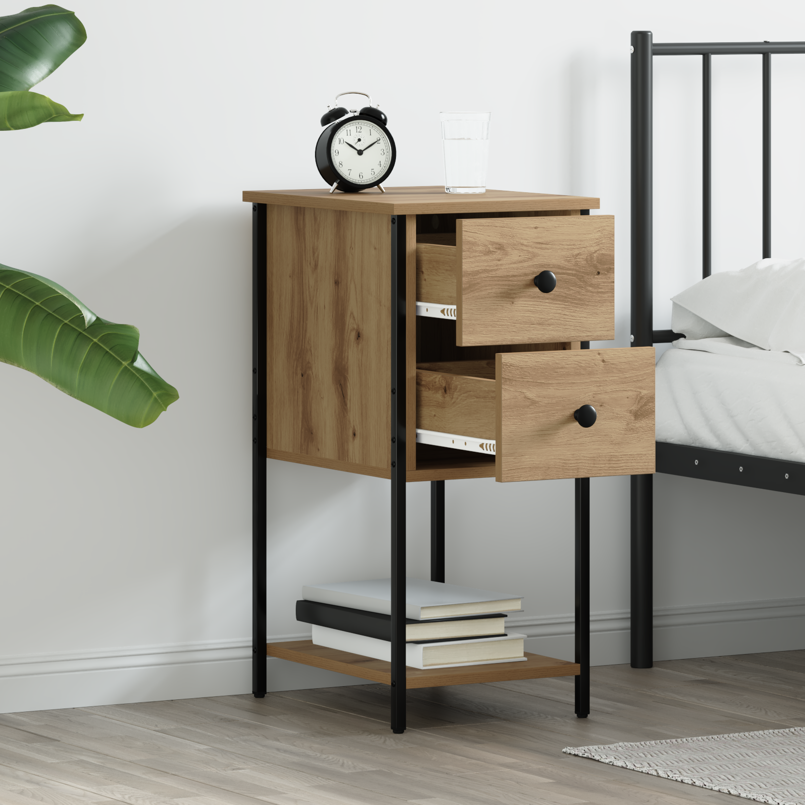 Tento noční stolek je stylová kombinace moderního designu a praktického úložného prostoru. Jeho čistý obdélníkový tvar dodává elegantní nádech do jakékoli ložnice. Bez problémů se hodí k různým dekorativním stylům a je skvělý na úsporu místa v menších pokojích. Perfektně uloží osobní věci, lampy nebo další drobnosti, což z něj dělá univerzální volbu pro každou domácnost.