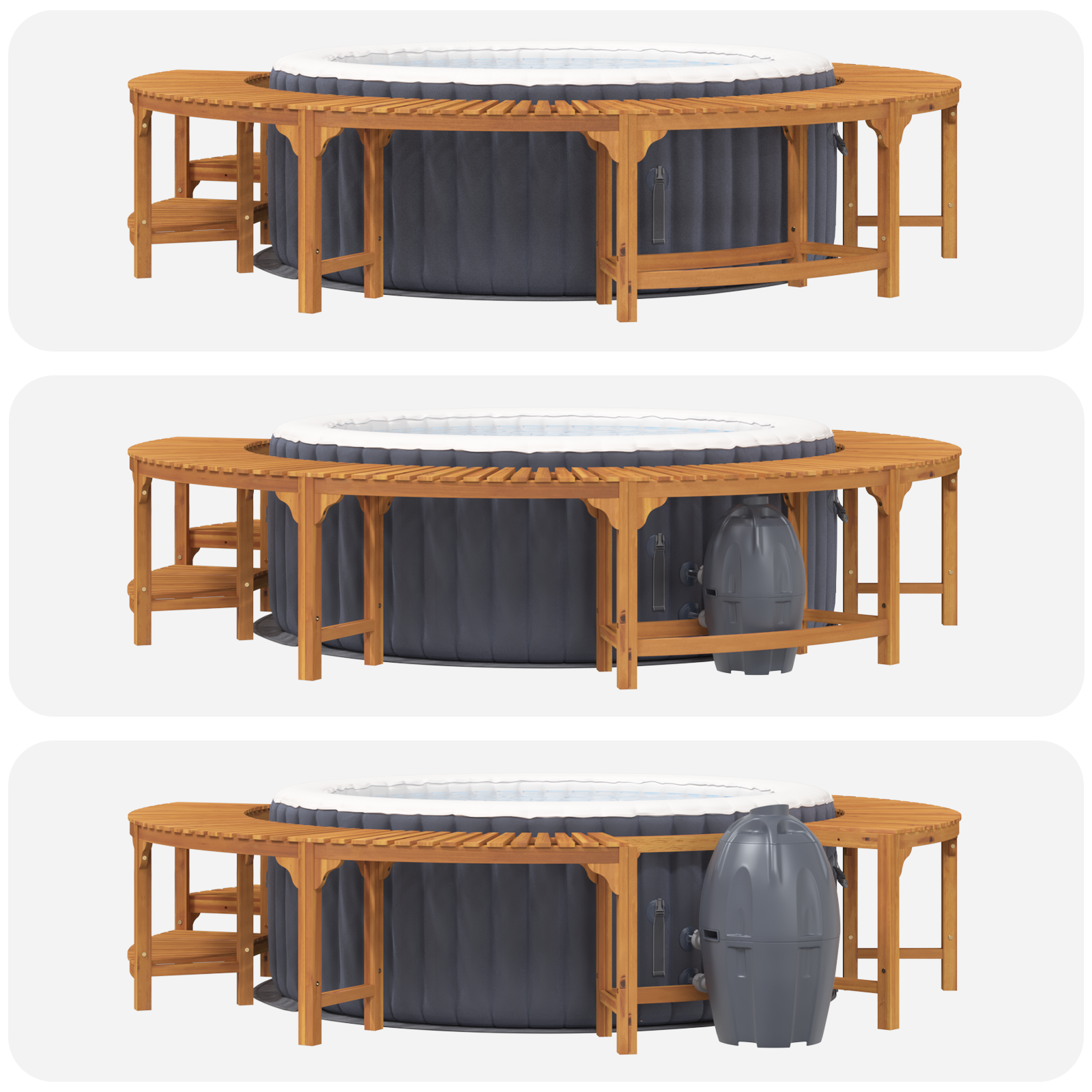 Tahle vířivková ochrana je trendy a praktická volba pro vaši venkovní plochu, skvěle sedí k vaší vířivce a vytváří skvělé místo na relaxaci. Vyrobený z masivního akáciového dřeva je odolný a má krásnou přírodní texturu. Není to jen ochrana, ale i skvělý doplněk k celkovému vzhledu vaší zahrady. Moderní design sedí různým stylům, což z něj dělá ideální volbu pro ty, suitable for co chtějí pohodlí a styl.