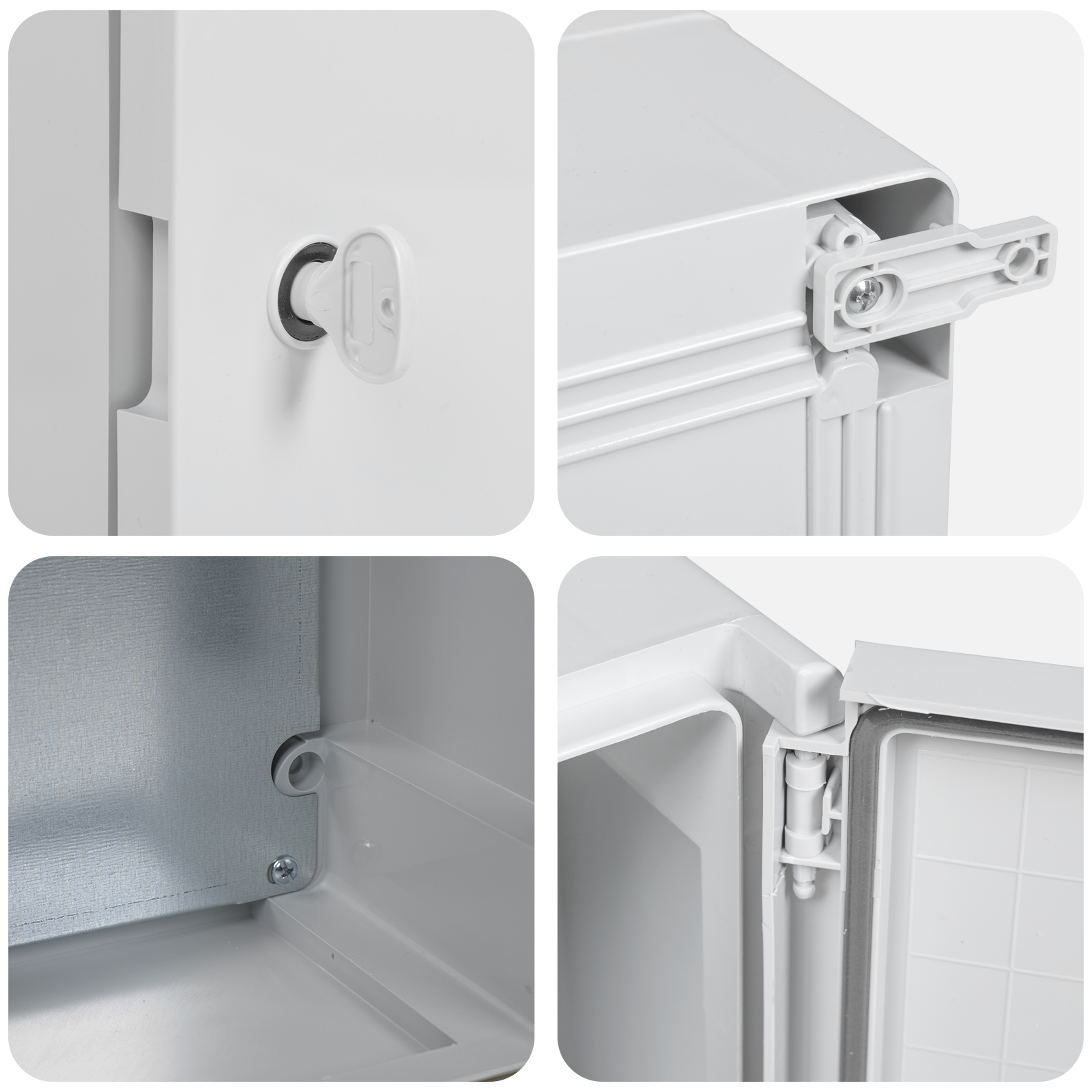 Tahle skříňka z ABS plastu je super na různé použití, ať už dovnitř nebo ven. Ochrání tvoje elektrické komponenty jako digitální profík. Moderní design s čistými liniemi se hodí jak do industráku, tak i k tobě domů. Je ideální na stability, dílny nebo prostě tam, kde potřebuješ spolehlivé uskladnění, a ten šedý hladký povrch dodává eleganci a funkčnost.