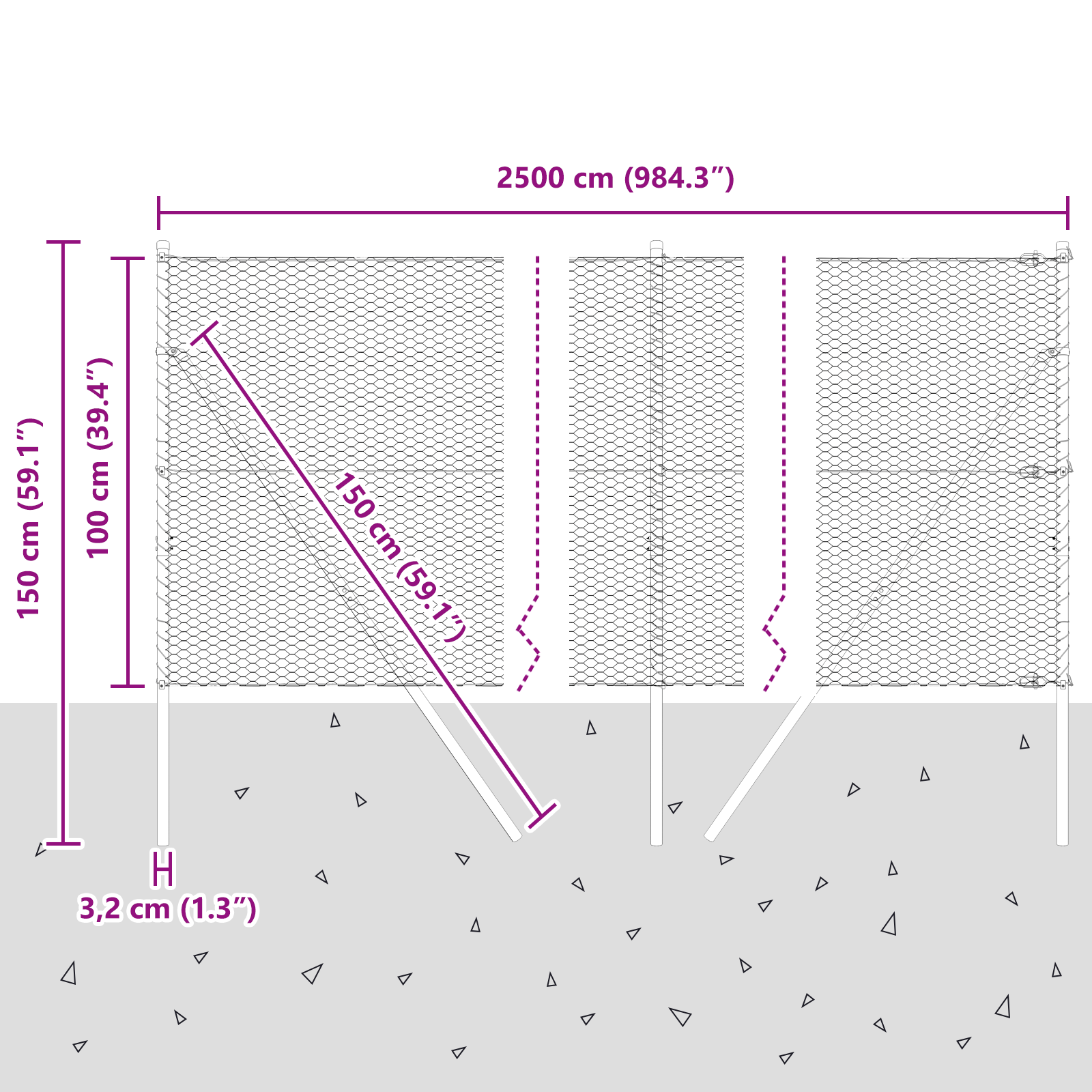 • Celkové rozměry: 2500 x 3,2 x 100 cm (D x Š x V)