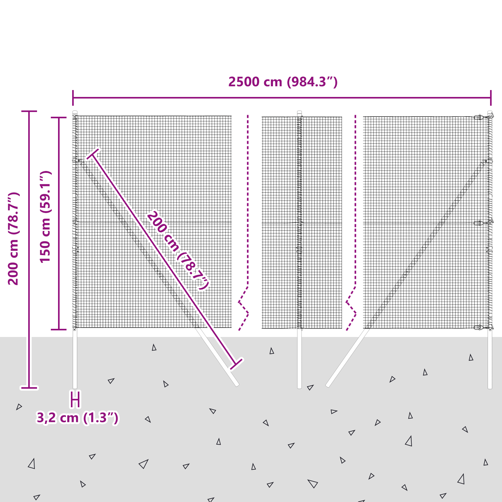 • Celkové rozměry: 2500 x 3,2 x 150 cm (D x Š x V)