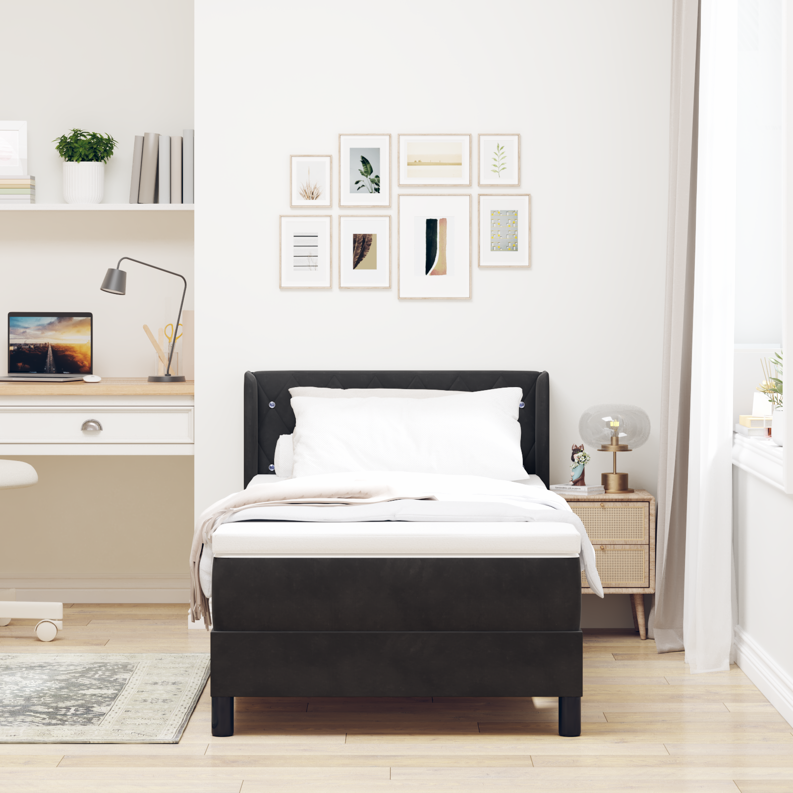Tato moderní postel na pružině je stylový doplněk do každé ložnice. Je minimalistická s čistými liniemi a funkční estetikou, kombinující komfort a styl, takže jí ocení každý, kdo má rád moderní design. Skvěle se hodí k různým stylům interiéru a může to být volba pro jednotlivce i páry, kteří chtějí pohodlné noci v trendy prostředí.