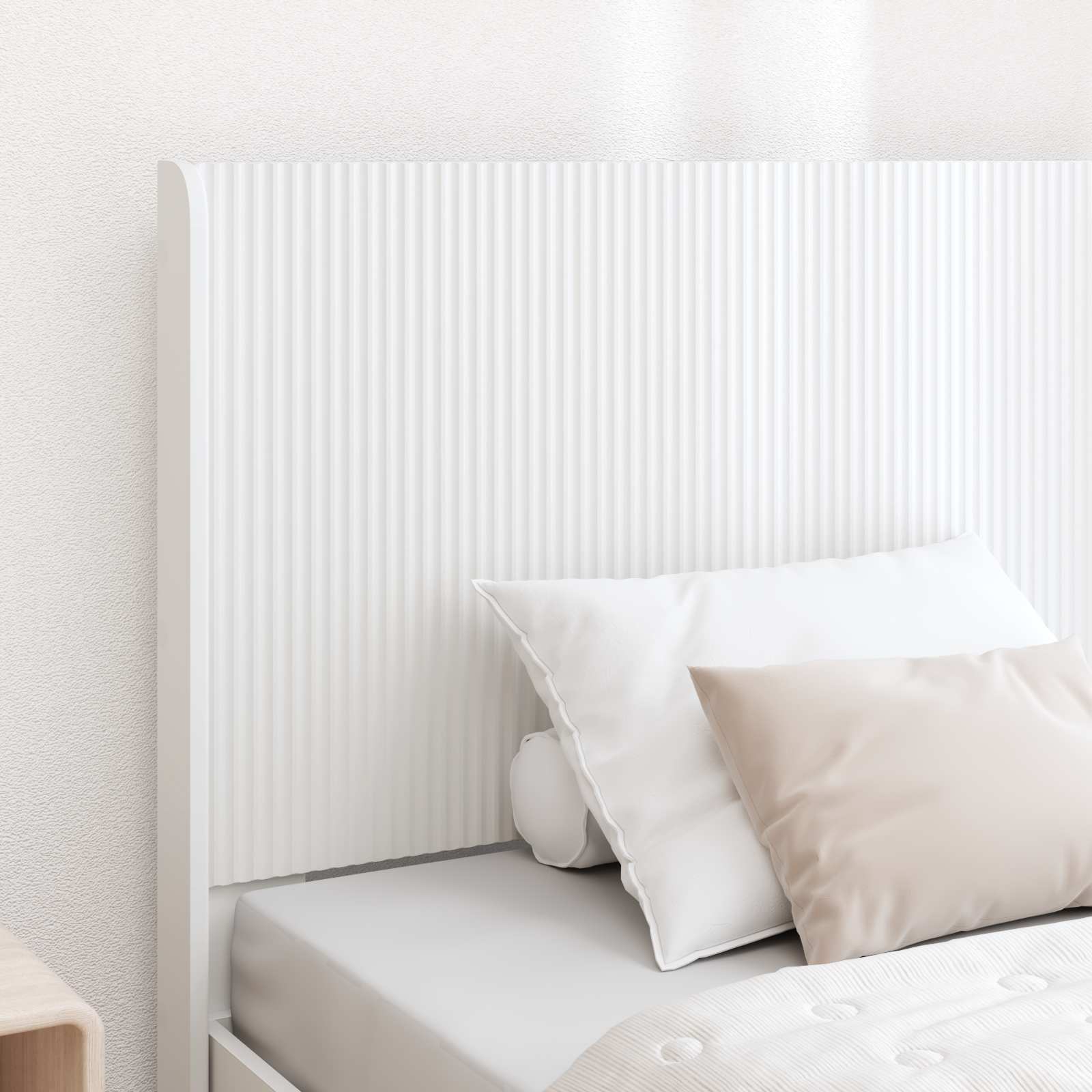 • Design čelního polštáře s lamelami: Tento rám postele s lamelovým čelním polštářem spojuje pohodlí s nadčasovou elegancí. Dává oporu na lenošení, čtení nebo odpočinek v posteli, zatímco jeho styl dodává do ložnice elegantní nádech.