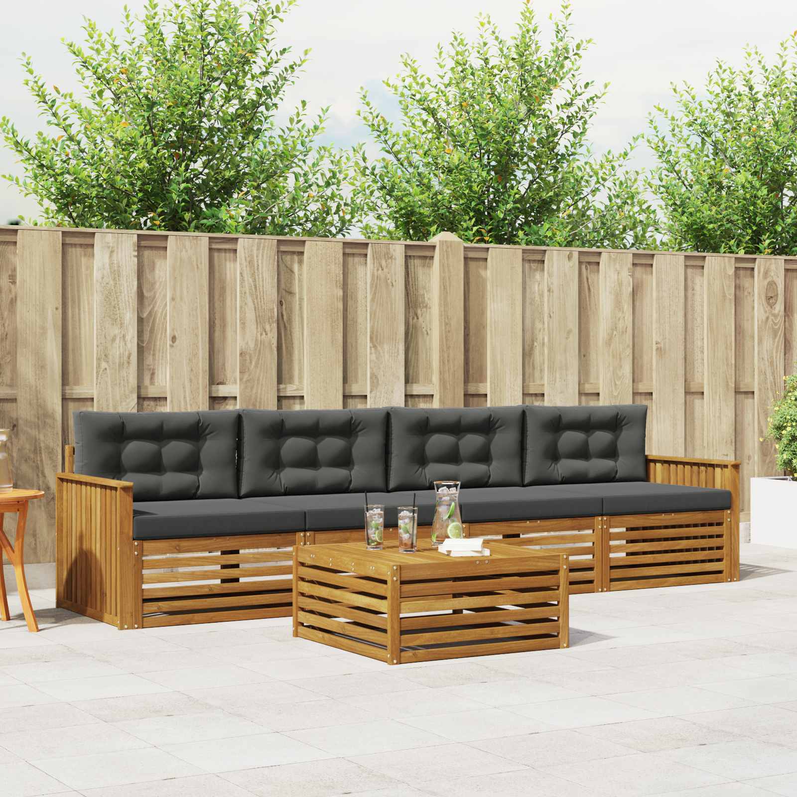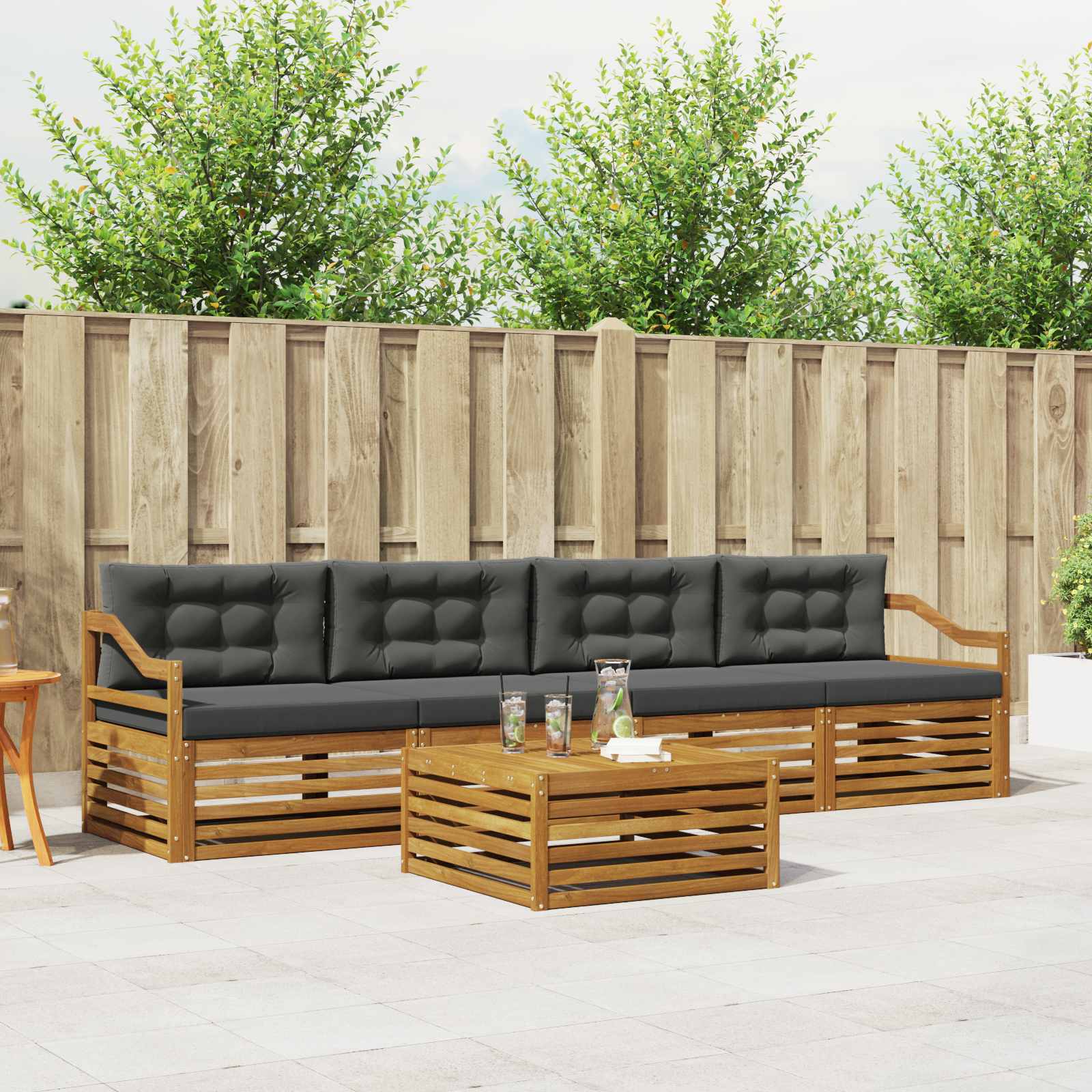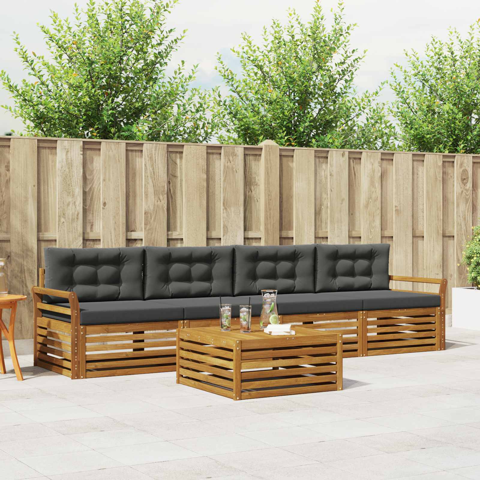 Tato sada venkovního nábytku kombinuje styl a funkčnost a stává se tak středobodem každé zahrady nebo terasy. S moderním designem, čistými liniemi a minimálním zdobením vypadá elegantně a zároveň je ideální pro relaxaci a společenská setkání. Celá z masivní akácie, zajišťuje trvanlivost a vizuální přitažlivost, což ji činí dokonalou volbou pro ty, co žádají praktičnost a hezký design venkovního nábytku. Odolná akácie: Sada z masivní akácie se vyznačuje odolností vůči povětrnostním vlivům. Robustní konstrukce poskytuje stabilitu, zatímco teplý přírodní tón oživuje každou zahradu nebo terasu. Odolný design: S lakovaným povrchem, který zajišťuje ochranu před sluncem a deštěm, si sada zachovává krásný vzhled i funkčnost. Díky tomu je dlouhotrvající a vhodná pro jakékoli venkovní prostředí. Funkční prvky: Každý kus je navržen nejen pro styl, ale i pro pohodlí. Zajišťuje výjimečné pohodlí a harmonický design, který se hodí pro různé venkovní aktivity. Pohodlí a variabilita: Modulární design umožňuje různé uspořádání, které se hodí pro relaxaci, posezení s přáteli nebo klidné chvíle s knihou. Sada skvěle přizpůsobí jakémukoli venkovnímu prostředí a maximalizuje komfort. Snadná údržba: Udržujte nábytek v pohodě, jen utřete povrch vlhkým hadříkem a vyhněte se tvrdým čisticím prostředkům. Pravidelná péče udržuje vzhled a životnost nábytku.