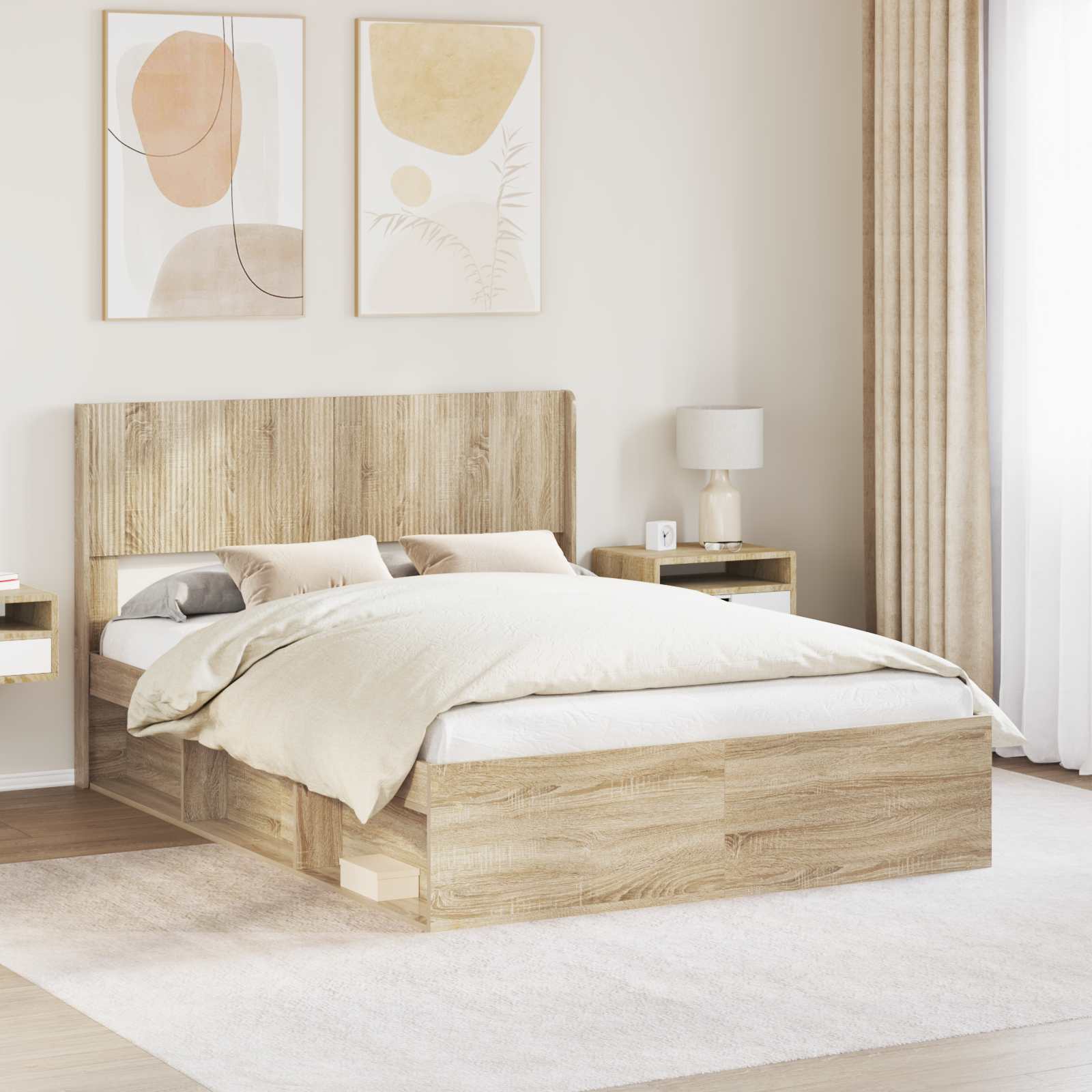 Tento moderní rám postele z kompozitního dřeva je užitečný a zároveň stylový doplněk do každé ložnice. Je navržen s čistými liniemi, které vyjadřují moderní šarm, a nabídce pohodlné místo na odpočinek i úložný prostor, bez ztráty stylu. Materiál kompozitní dřevo : Rám postele je vyroben z kompozitního dřeva, což zajišťuje dlouhou životnost a elegantní vzhled. Takto bude spolehlivým středobodem vaší moderní ložnice. Lamelová základna : Naše postel má lamelovou základnu z překližky, která poskytuje skvělou oporu pro pohodlný spánek. Tato robustní základna snižuje potřebu boxspringu a zvyšuje šanci na dlouhou životnost. Vestavěné úložiště : Chápeme, že je potřeba mít v ložnici více úložného prostoru. Tento rám postele nabízí praktické vestavěné úložné prostory, takže budete mít spací prostor v pořádku a bez nepořádku. Snadná údržba : Aby váš rám postele vypadal skvěle, stačí ho otřít vlhkým hadříkem. Tím zajistíte, že váš nábytek zůstane jako nový s minimálním úsilím. Kompletní balení : Dodává se jako 1 x rám postele s čelem a obsahuje vše potřebné pro snadnou montáž, přičemž pro složení doporučujeme, aby to dělaly dvě osoby a měly po ruce šroubovák.
