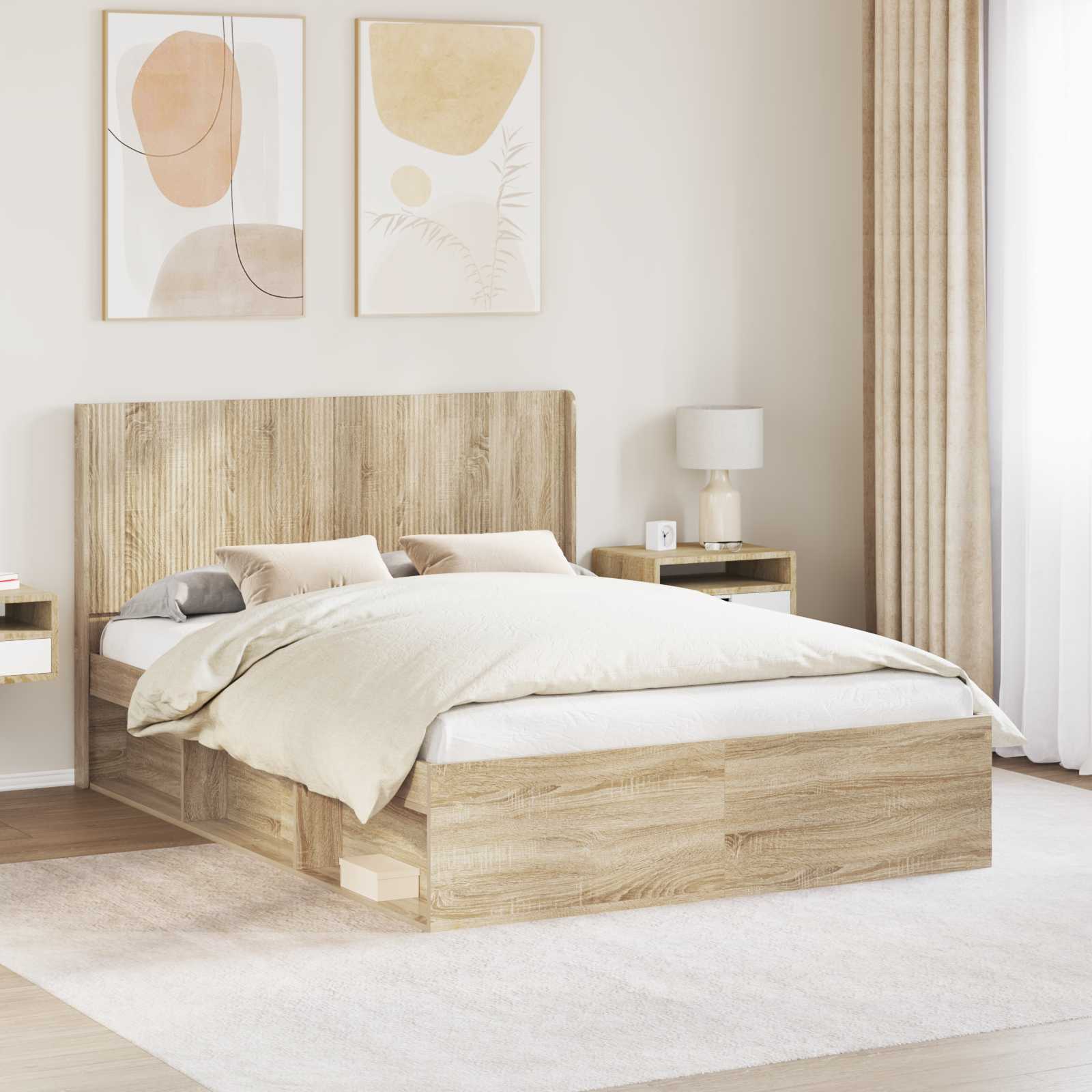 Tento moderní rám postele je promyšleným doplňkem každé ložnice, nabízí současný styl spolu s praktickou funkčností. Je vyroben z inženýrského dřeva a má čisté linie. Čelní polštář dodává k eleganci a designu, což ho činí variabilním pro různé styly ložnic. Ideální pro městské byty a útulné domovy, tenhle rám postele zvyšuje atmosféru spánku efektivním využitím prostoru a okouzlujícím designem. Silný a podpůrný rám s lamelovou základnou: Vyrobený z odolného inženýrského dřeva, tento rám postele poskytuje stabilní podporu. Lamelová základna zajišťuje skvělou oporu pro matraci a prodyšnost, což eliminuje potřebu box springu. Design čelního polštáře s lamelami: Tento rám postele s lamelovým čelním polštářem spojuje pohodlí s nadčasovou elegancí. Dává oporu na lenošení, čtení nebo odpočinek v posteli, zatímco jeho styl dodává do ložnice elegantní nádech. Hojná úložná řešení: Rám má vestavěné úložné prostory po stranách pro osobní věci. Maximálně využívá prostor na obou stranách, takže vaše ložnice zůstane uspořádaná a bez nepořádku - ideální na každodenní použití. Moderní minimalistický design: S čistými liniemi a štíhlým stylem přináší rám moderní minimalistický vzhled do každé ložnice. Jeho jednoduchý design podporuje klidnou atmosféru, čímž vytváří příjemné místo pro spánek. Jednoduchá údržba: Tato postel je navržena tak, aby vydržela a vyžaduje málo péče. Stačí ji jemně otřít hadříkem, aby zůstala čistá, ideální pro rušné životy. Snadná údržba pomáhá udržet dokonalý vzhled a prodlužuje životnost postele.