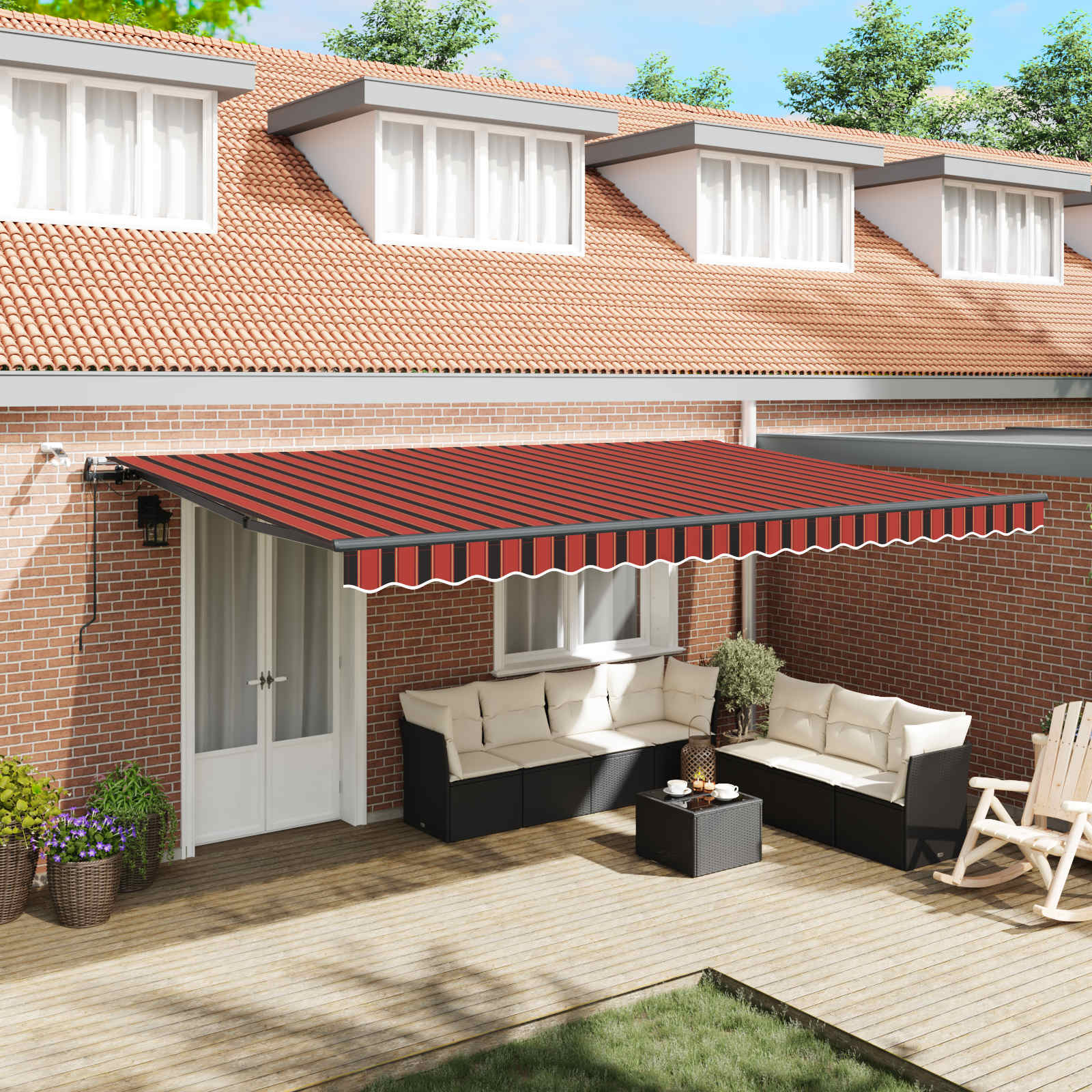 Vytvořte si útulné místečko v chládku na čerstvém vzduchu s touto zatahovací markýzou! Zahradní markýza má práškově lakovaný hliníkový rám, který nerezaví, je lehký, a přitom tvoří velice pevnou konstrukci. Stříška je vyrobená z polyesteru s vysokou hustotou a s PU povlakem, skvěle proto odolává vodě i UV záření. Úhel a výšku markýzy si navíc můžete nastavit tak, aby to vyhovovalo vašim momentálním potřebám. Automatickou stříšku snadno roztáhnete a zatáhnete dálkovým ovladačem. K hladkému ovládání vám poslouží také dlouhá ruční klika. Markýza je dále opatřená senzorem větru, který ji za větrných dnů automaticky zavře. LED světla vám v noci poskytnou energeticky úsporné osvětlení. Roleta vás ochrání před UV paprsky a zajistí vám soukromí. Děti by měly být pod dohledem, aby si se spotřebičem nehrály. Udržujte děti mimo prostor montáže. Pozor: Před použitím si pozorně přečtěte návod k použití a uschovejte jej pro další použití.