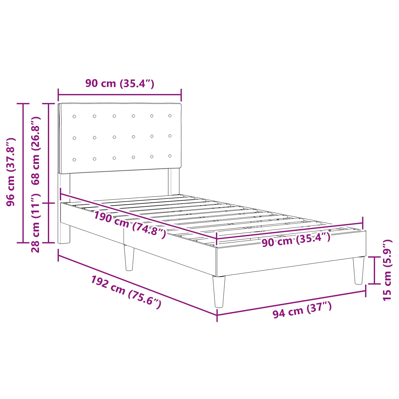 • Odolné materiály: Tento rám postele je vyroben z tkaniny a překližky, což zajišťuje kvalitní konstrukci na dlouho. Materiály poskytují pevný základ pro matraci, který zvyšuje celkový komfort a stabilitu při spaní, a málo se udržuje.