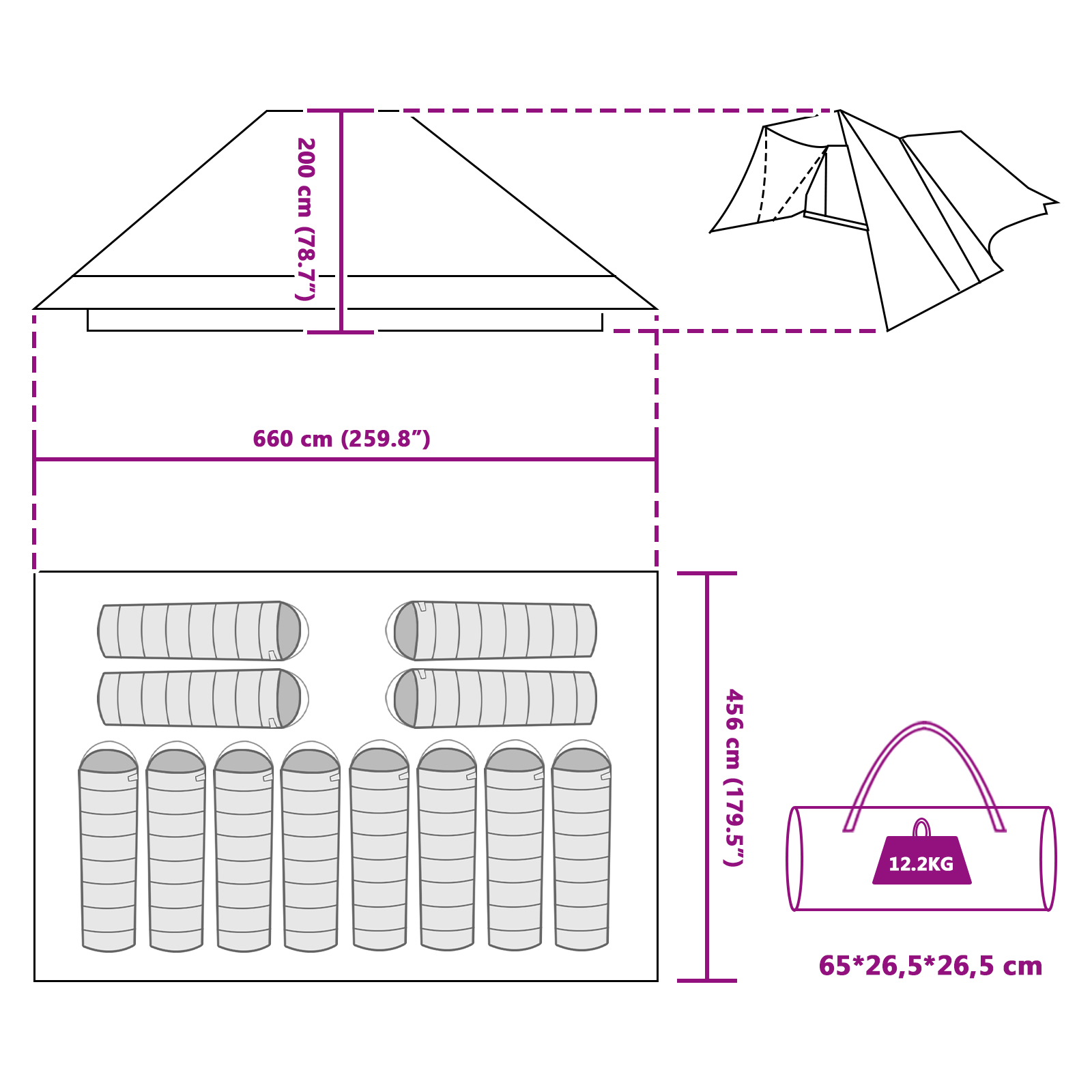 Tento rodinný stan je navržený pro šest lidí, takže je dost místa a pohodlí pro rodinné nebo skupinové kempování. Vypadá moderně a má čisté linie, je praktický a pěkně vypadá pro všechny fanoušky kempování. Hladká látka je super na letní výlety a poskytuje pohodlné místo na relaxaci a ochranu před počasím. Představte si, jak si s kamarády užíváte krásy přírody pod tímto prostorným stanem inspirovaným tipi.