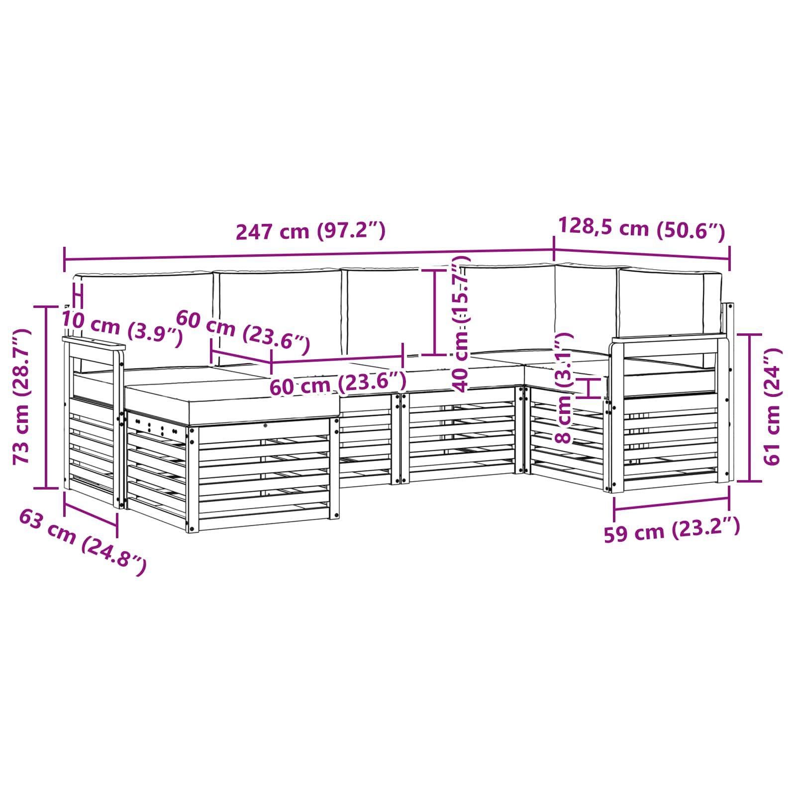 • 6 x Sedací polštář: 60 x 60 x 8 cm (D x Š x V)