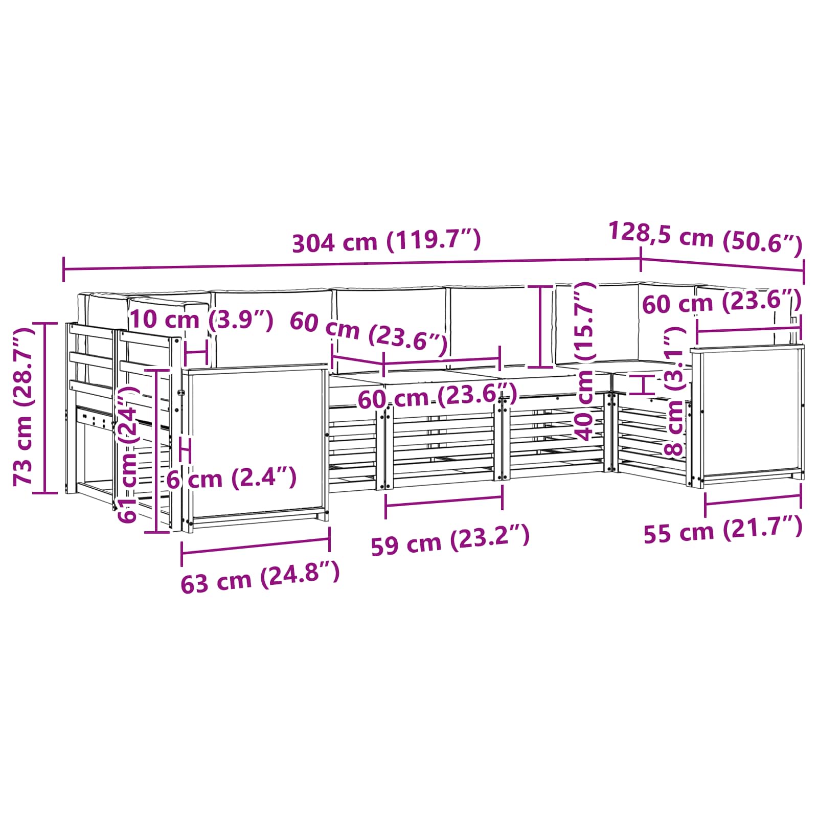 • 5 x Střední pohovka: 63 x 59 x 73 cm (D x Š x V)