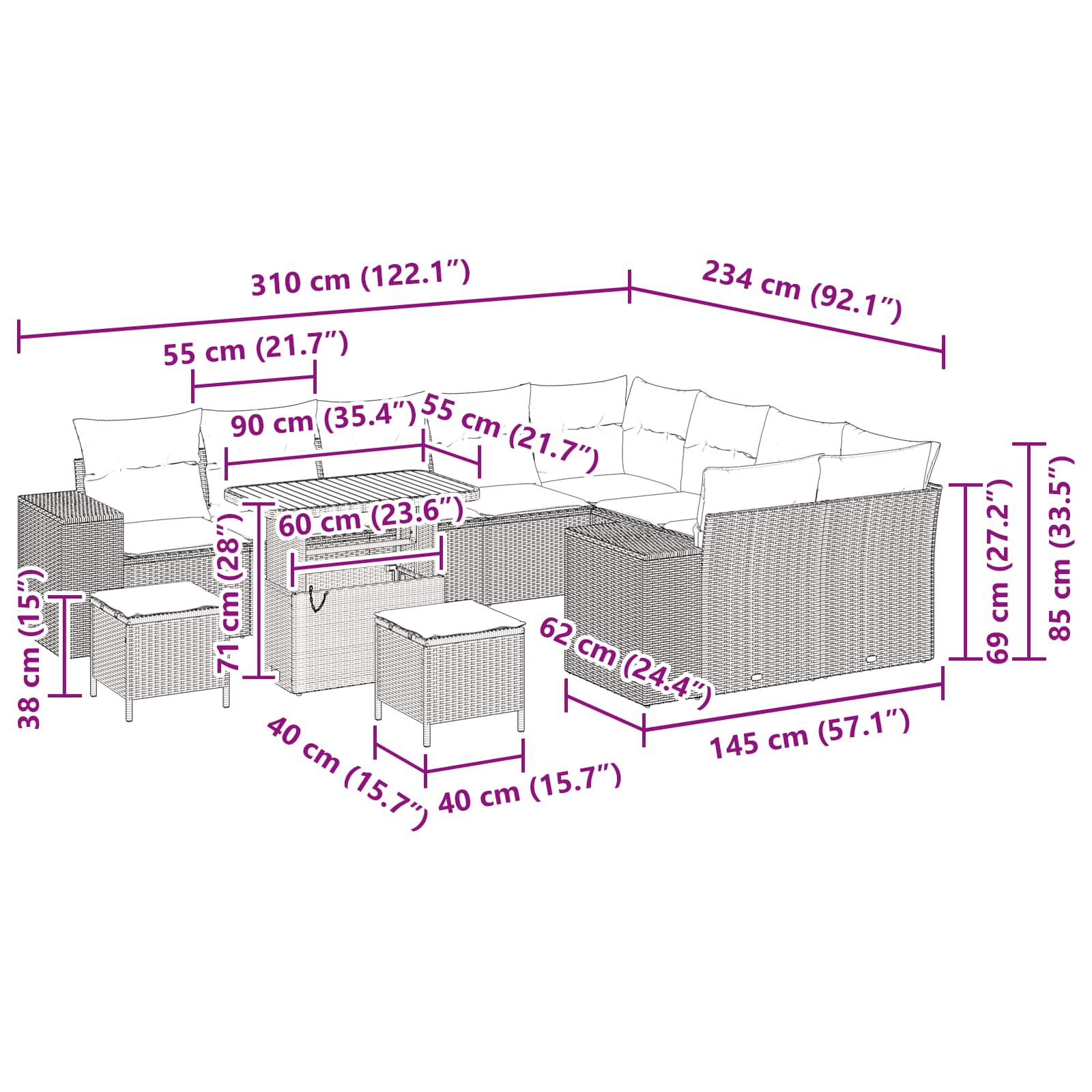 • Primární materiály: Tento zahradní gauč je převážně z poly ratanu, který je známý svojí odolností proti počasí. Pevné akáciové dřevo dodává hřejivý pocit a skvěle spojuje moderní a přírodní styl, díky čemuž je set trvanlivý.