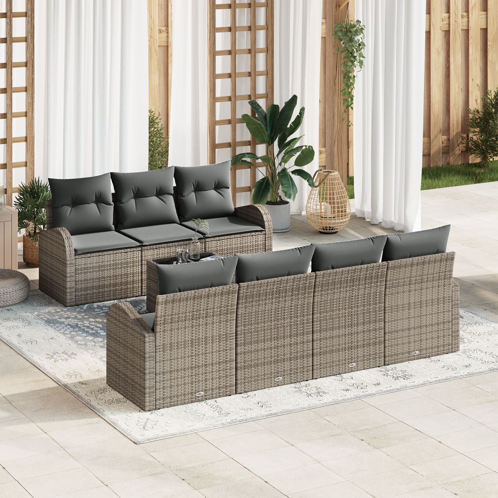 Tato moderní zahradní pohovková sestava přináší pohodlí a styl do vašeho venkovního prostoru. Navržená pro terasy nebo zahrady, sestava se vyznačuje minimalistickým designem a modulárním uspořádáním. Její čtvercový tvar se hodí do různých uspořádání, ideální pro malé setkání nebo jednostranný odpočinek. Vyrobena z kvalitních a odolných materiálů, odolává povětrnostním podmínkám a dodává venkovnímu dekoru nádech elegance. Ať už ji sdílíte s přáteli, nebo si užíváte klid, tato sestava promění vaši zahradu v příjemné útočiště.