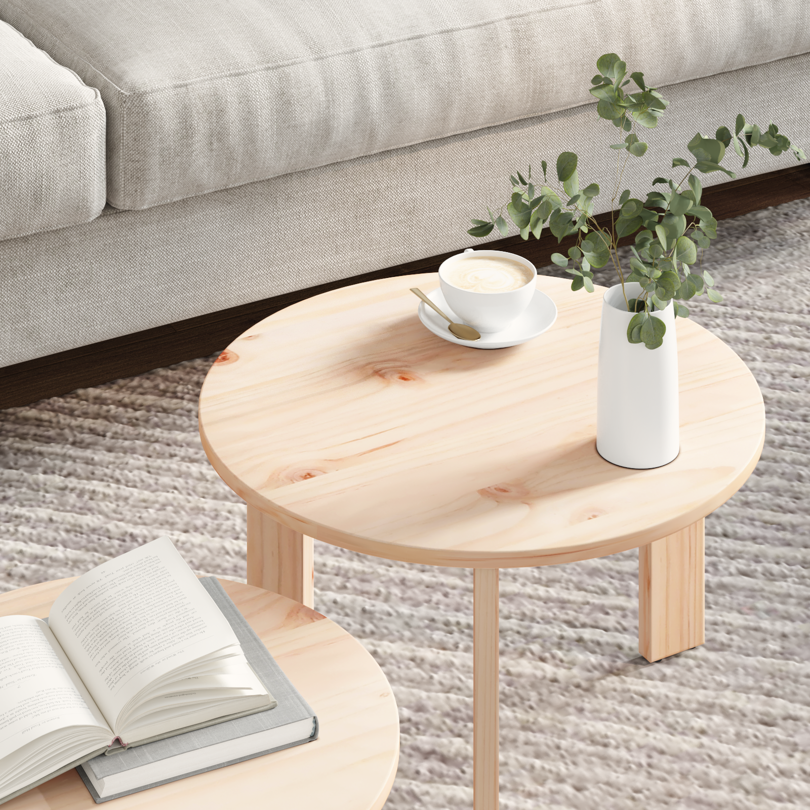 Tahle moderní kulatý konferenční stolek je skvělým přírůstkem do tvého obývacího prostoru. Dělá parádu svým nadčasovým designem a funkčností. Vyrobený z masivního borového dřeva, nádherně spojuje styl a odolnost. Jeho kulatý tvar a hladký povrch přidávají vášně, zatímco dřevěný vzhled přináší přirozenou krásu. Stolek je multifunkční - ideální jak na kávu, tak na vystavování cenných kousků.