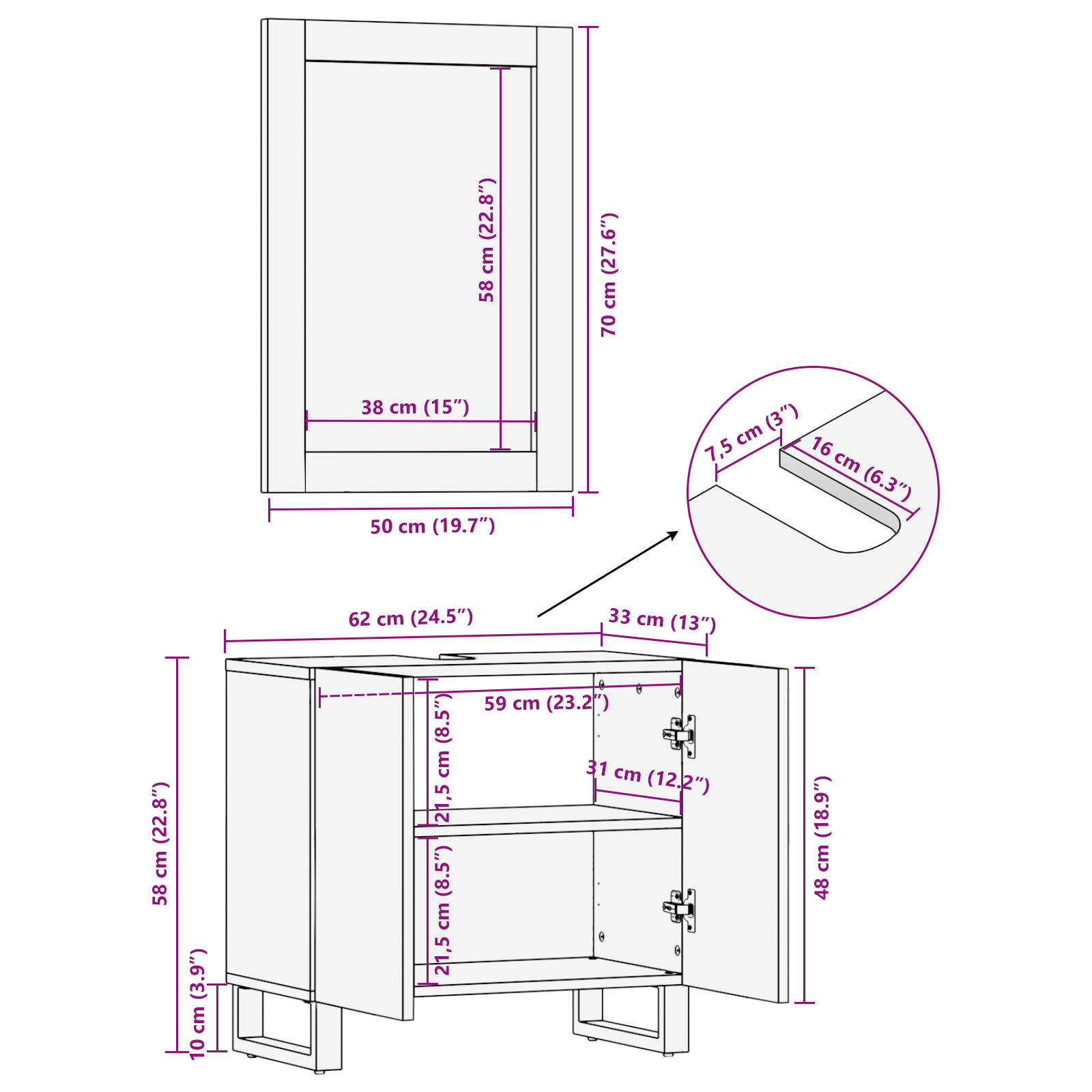 • Součásti: Set obsahuje moderní zrcadlo o rozměrech 50 x 70 cm, které jasně odráží tvůj vzhled. Dále je tu skříňka pod umyvadlo o rozměrech 62 x 33 x 58 cm s flush dveřmi a police, které nabízejí prostorné úložiště pro všechno potřebné, plus pevné černé kovové nohy.