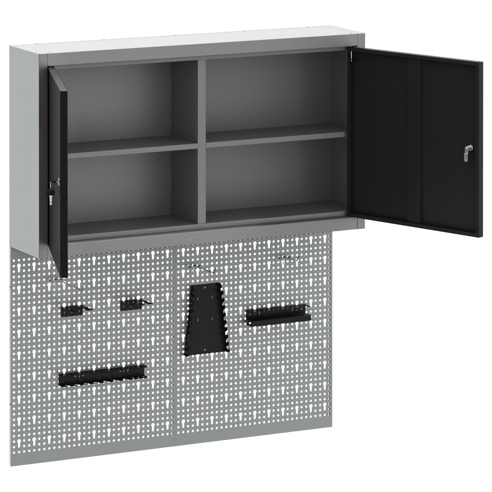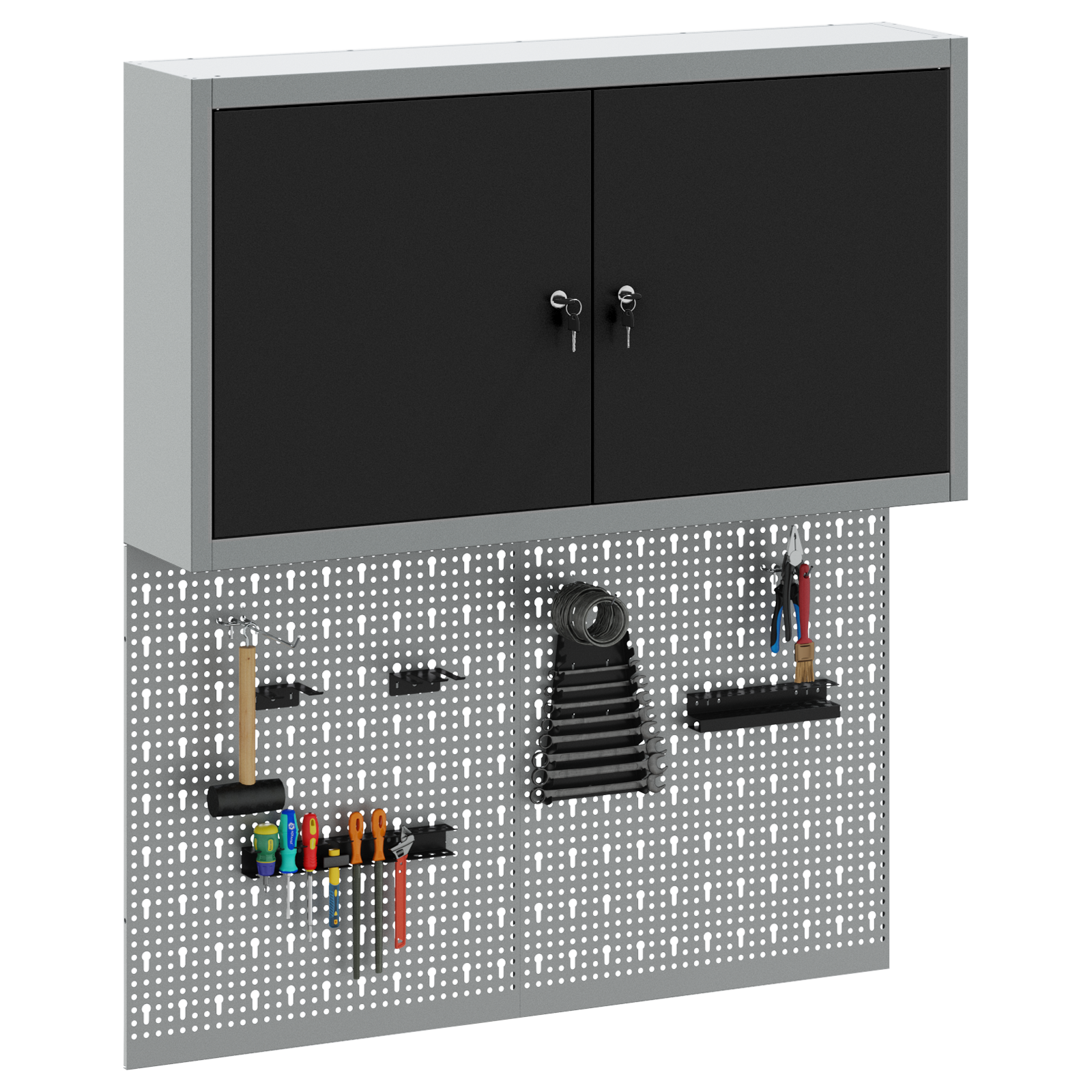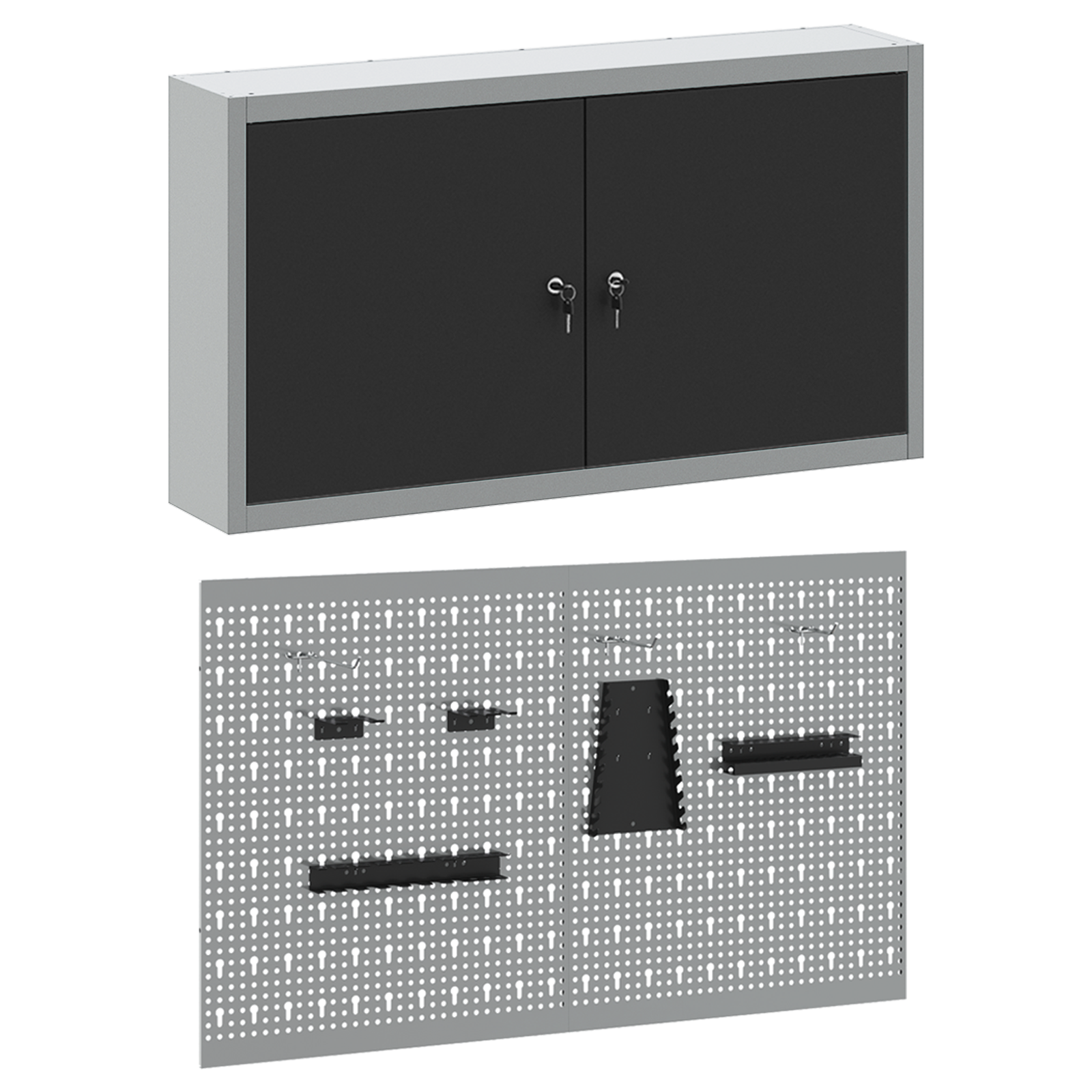 • Komplexní komponenty: Skříňka má kovové police z práškově lakované oceli, které snesou hodně hmotnosti a časté používání. Kovové závěsné desky umožňují snadné přizpůsobení organizace nářadí podle různých typů a velikostí nářadí.