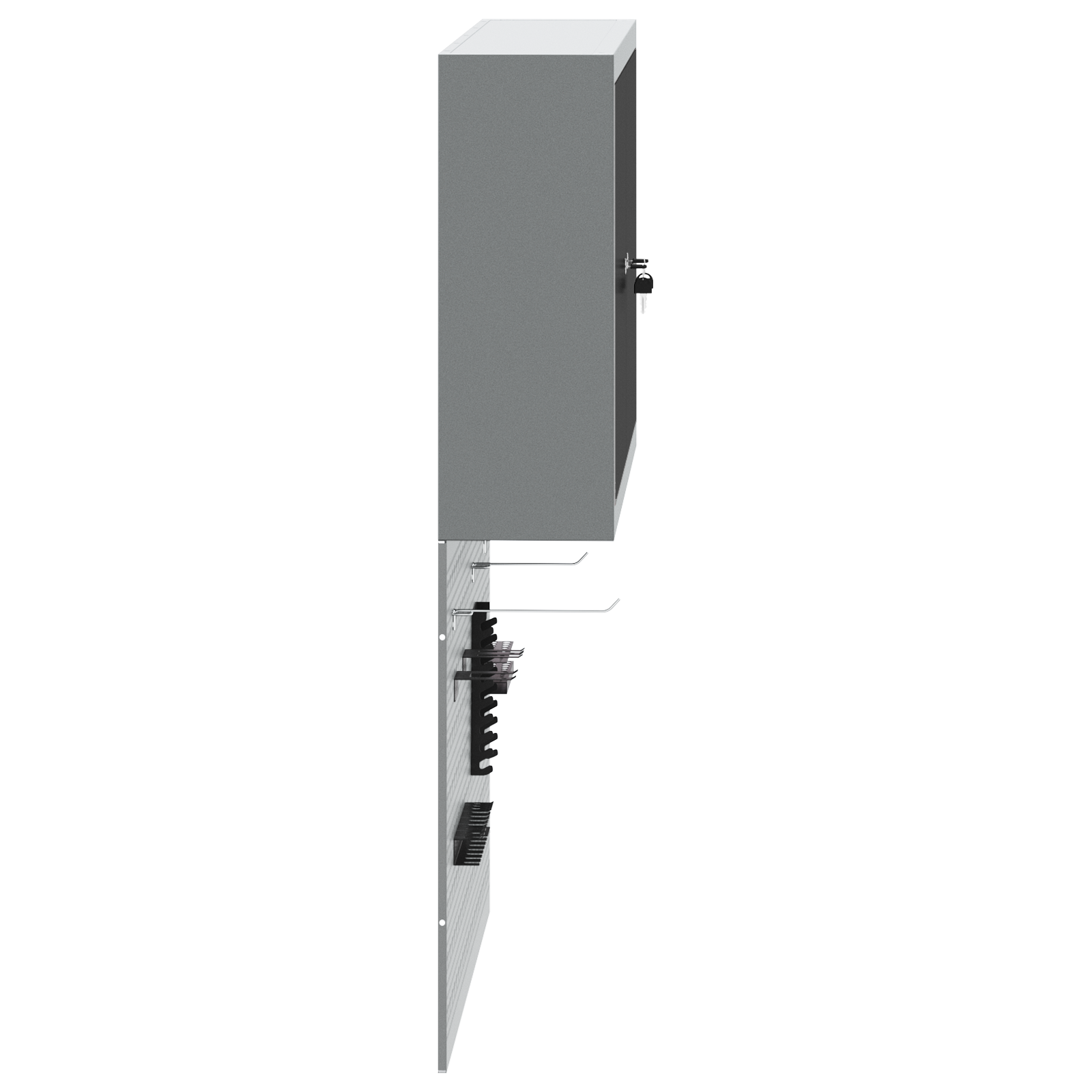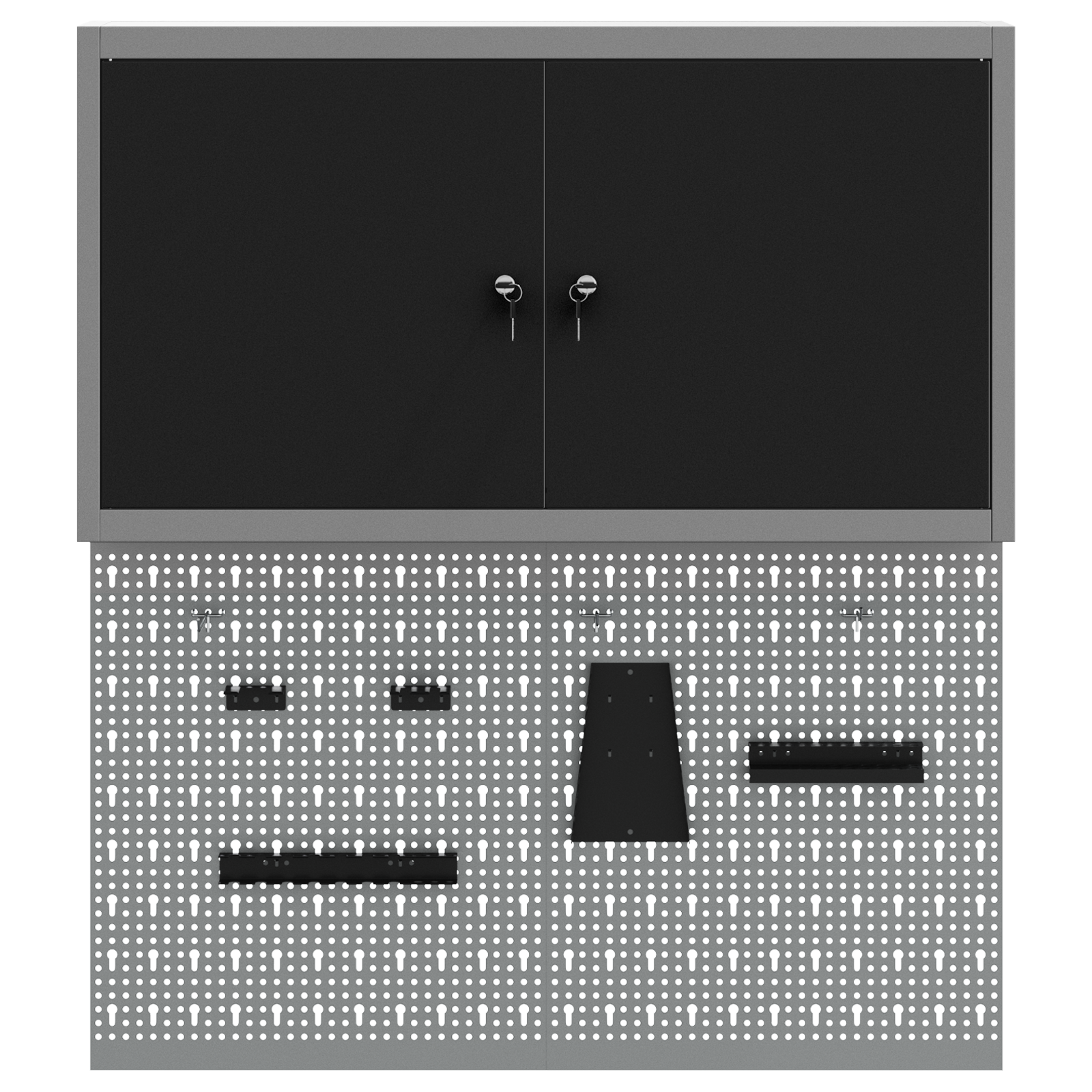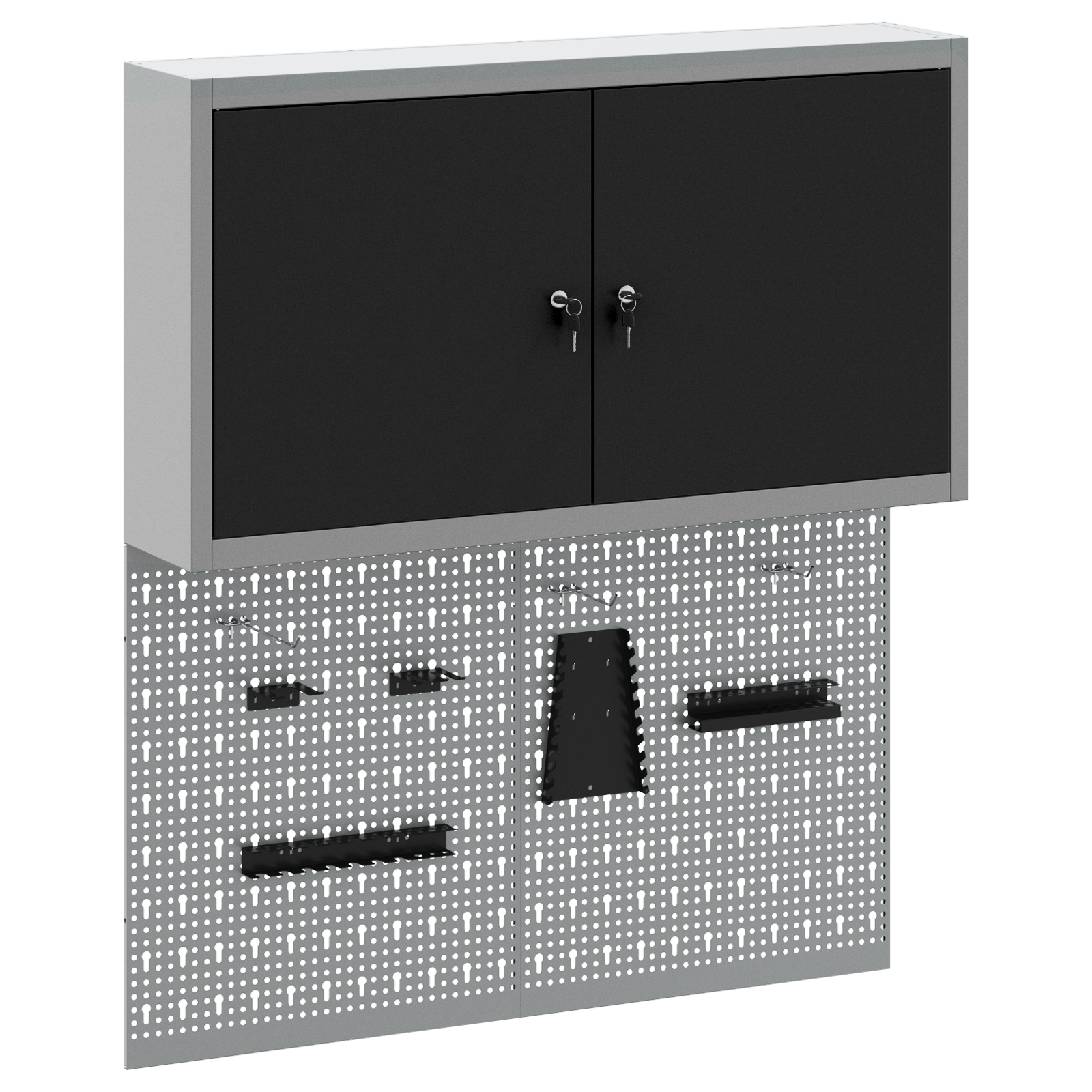 • Komplexní komponenty: Skříňka má kovové police z práškově lakované oceli, které snesou hodně hmotnosti a časté používání. Kovové závěsné desky umožňují snadné přizpůsobení organizace nářadí podle různých typů a velikostí nářadí.