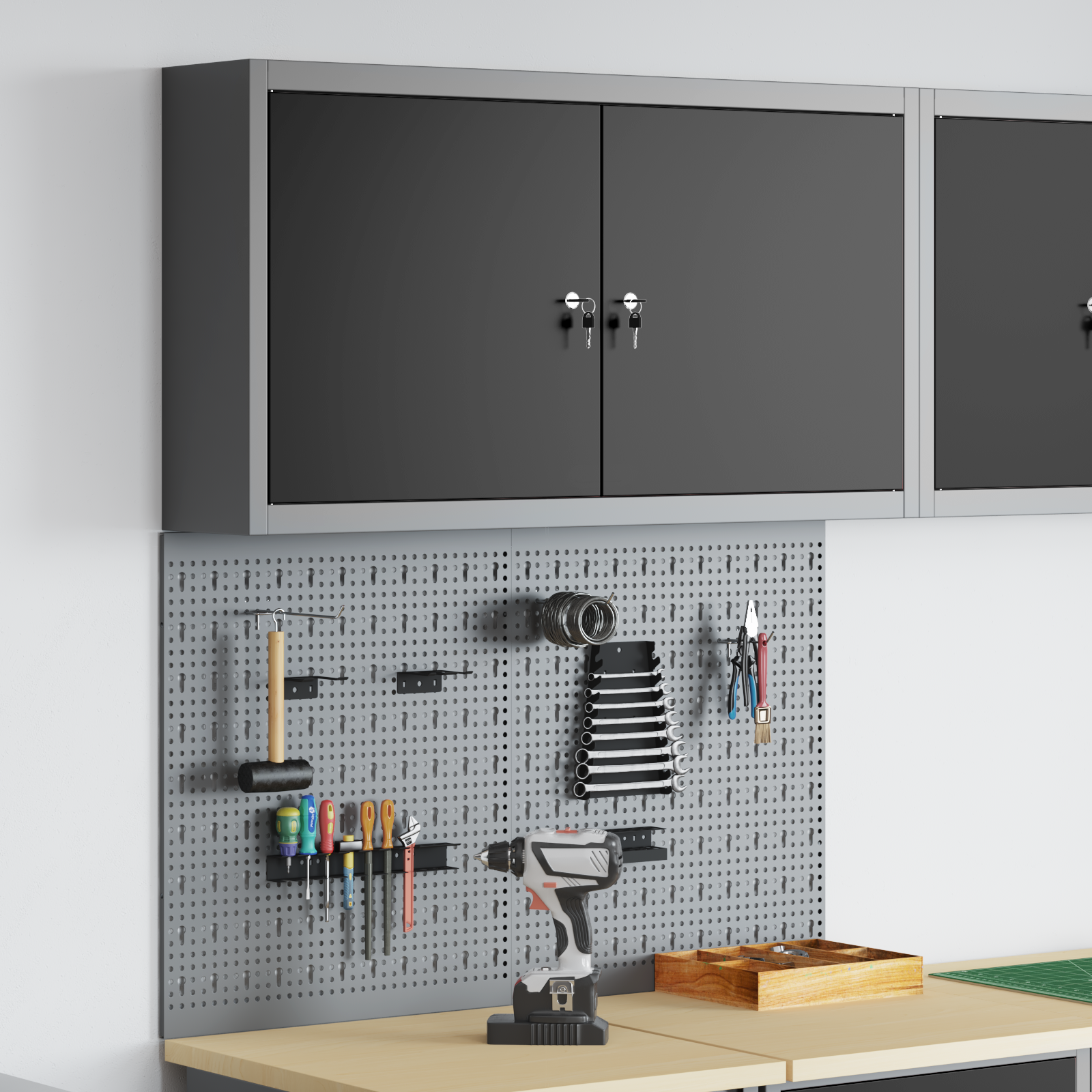 Tahle všestranná nástěnná skříňka na nářadí a souprava desek je nutnost, pokud chcete mít ve své dílně nebo garáži pořádek. S elegantním industriálním designem přináší městský nádech díky práškově lakované ocelové konstrukci a hladkému šedému povrchu. Určená do vnitřních prostor, skříňka skvěle uskladní nářadí, které bude přehledně a snadno dostupné. Integrovaná deska také zvyšuje funkčnost, protože umožňuje přizpůsobit si uspořádání nářadí podle vlastních potřeb.