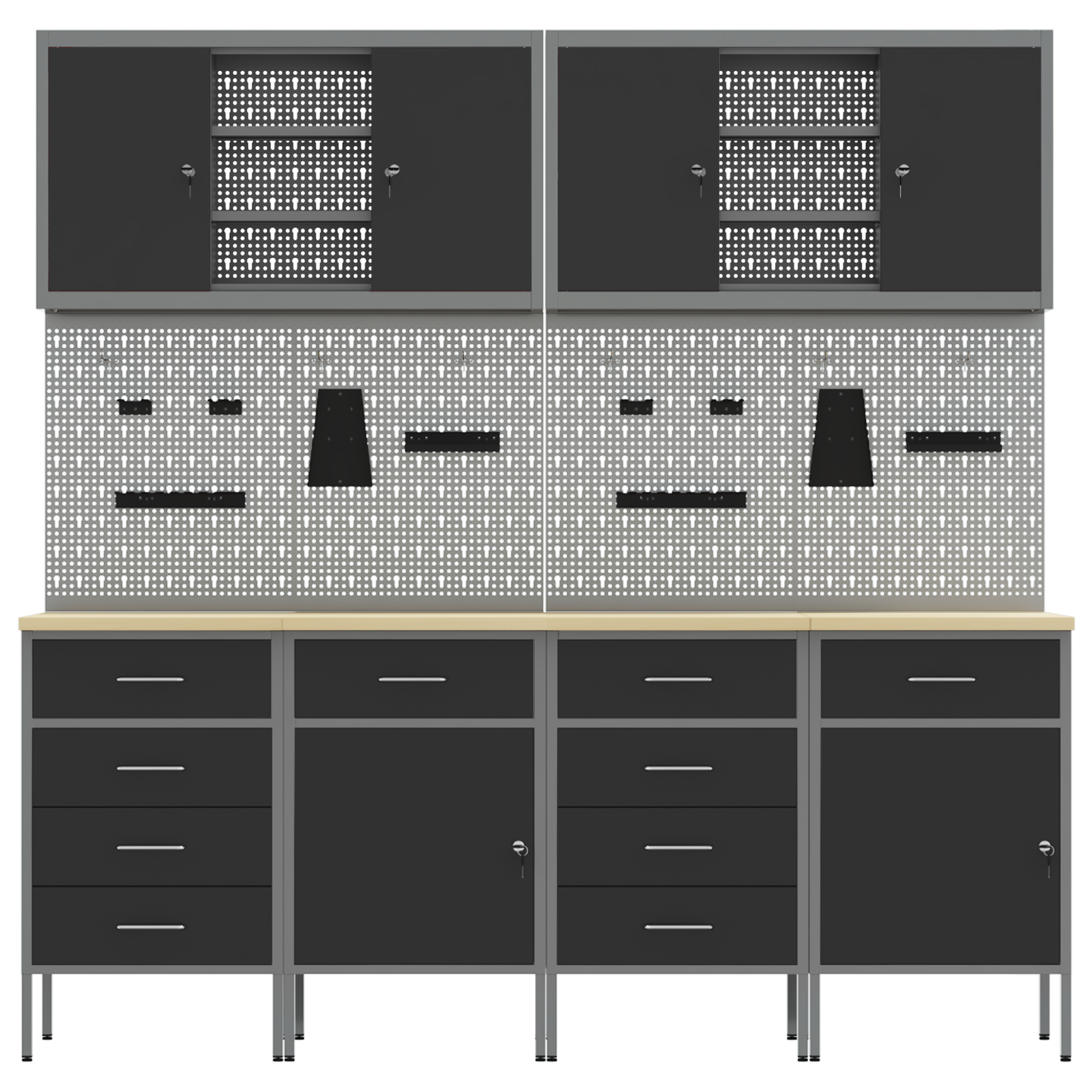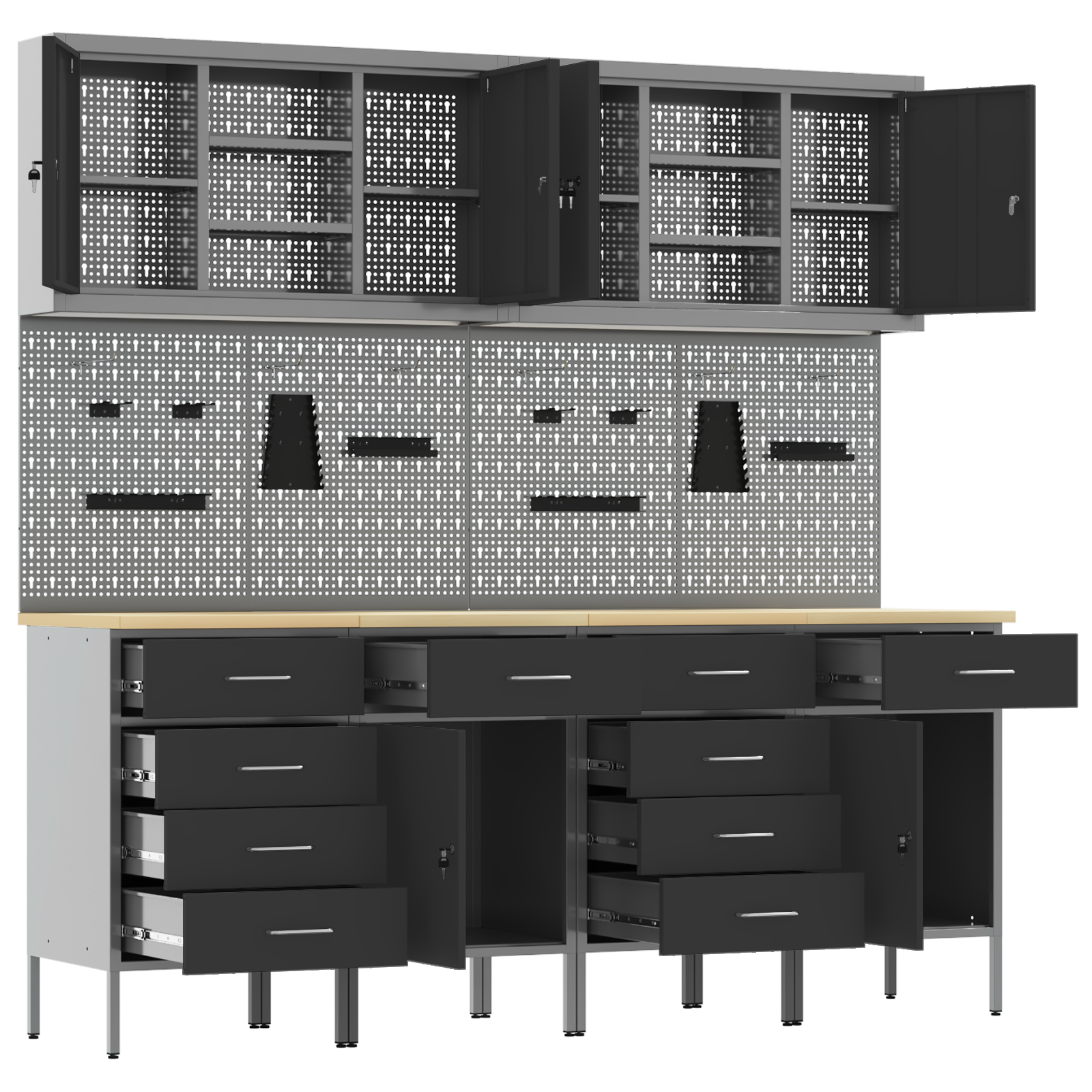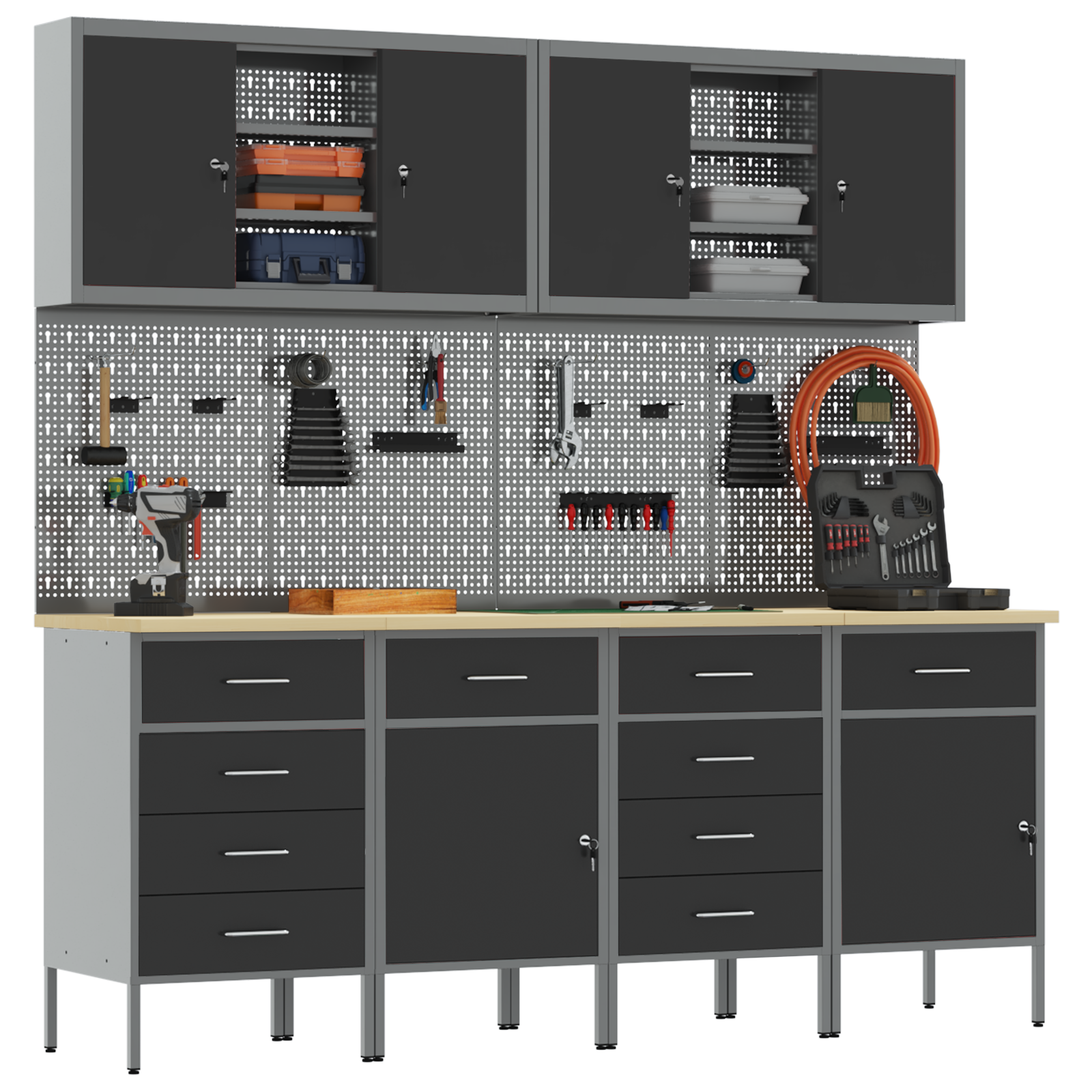 • Víceúčelové úložiště: Skříň má spoustu oddělení, šuplíků a polic, což nabízí skvělá organizační řešení. Efektivně uspořádá nástroje a materiály, což vám usnadní práci a zajistí, že všechno bude na místě. Jejím chytrým designem vyhovíte různým potřebám, od velkých nástrojů po malá příslušenství, takže je nepostradatelná pro uspořádané pracovní prostory.