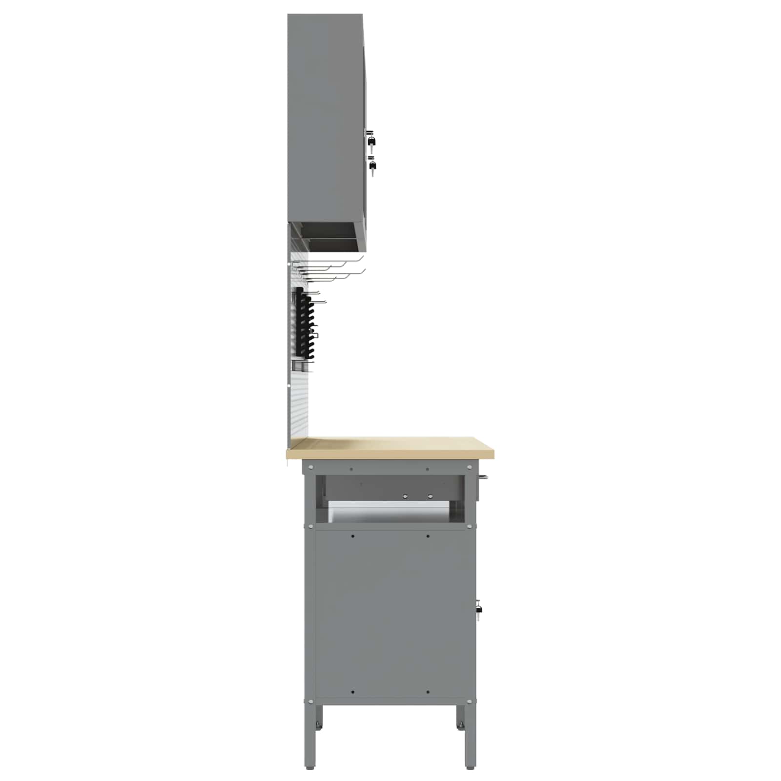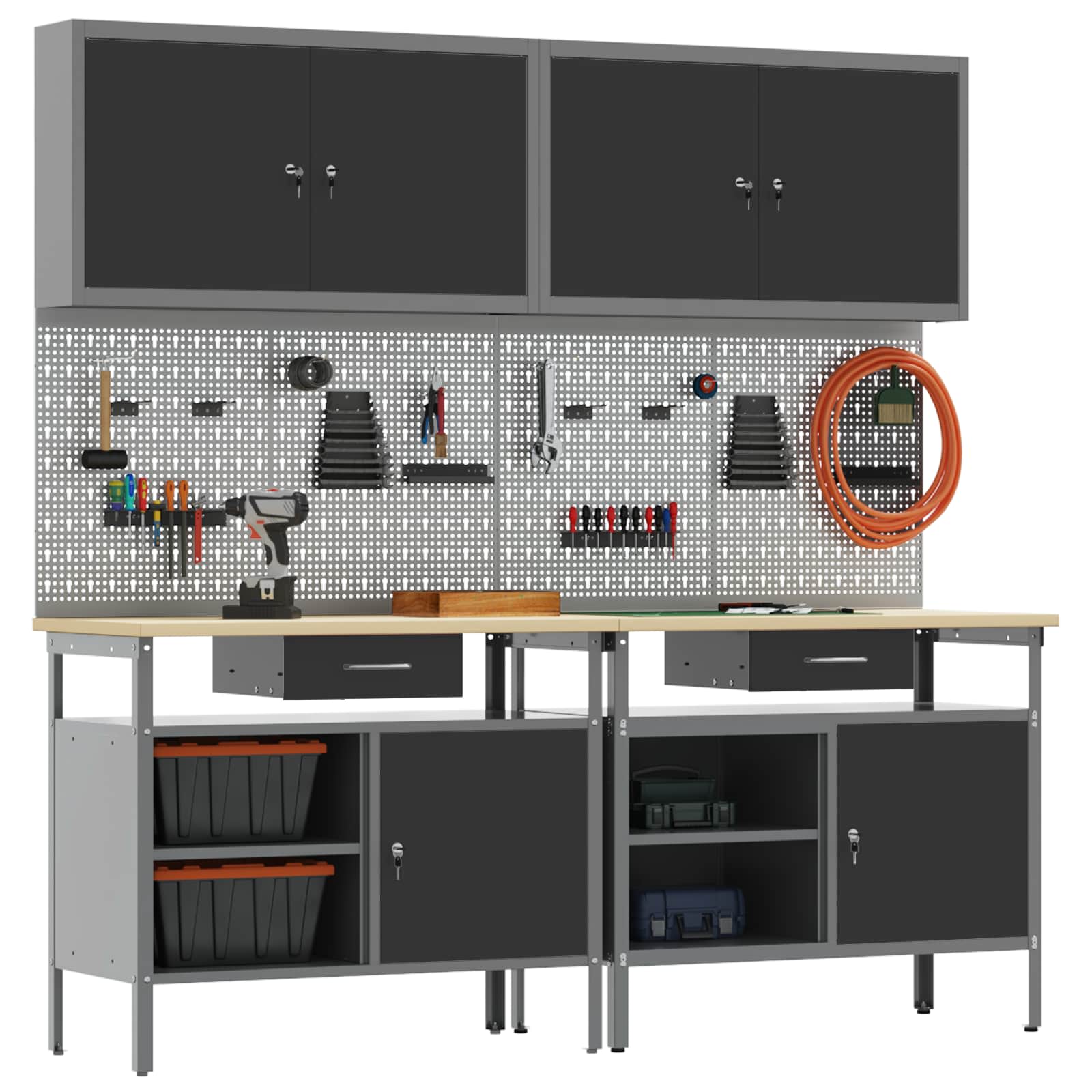 Tato sada pracovních stolů z oceli je ideální kombinací funkčnosti a průmyslového stylu pro profesionální dílny i domácí garáže. Obdélníkový stůl zvládne i těžší úkoly a má moderní design. Díky hladkému povrchu se bezproblémově hodí do jakéhokoliv prostoru. Kovové police poskytují dost úložného místa, takže máte nářadí a potřeby pěkně srovnané a přehledné. Představte si tento stůl jako středobod vašeho pracovního místa, který dodává atmosféru profesionality, pořádku a stylu.