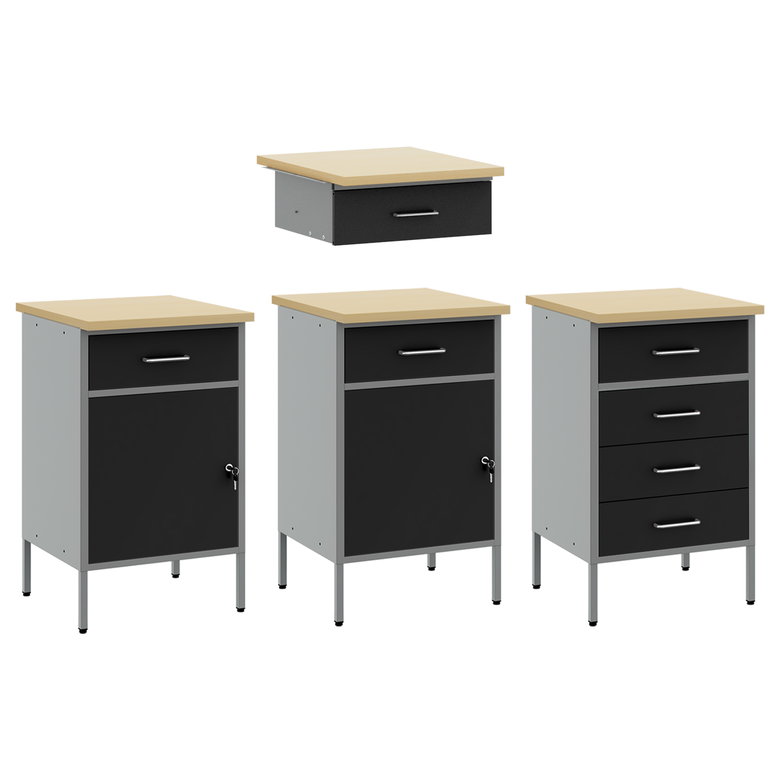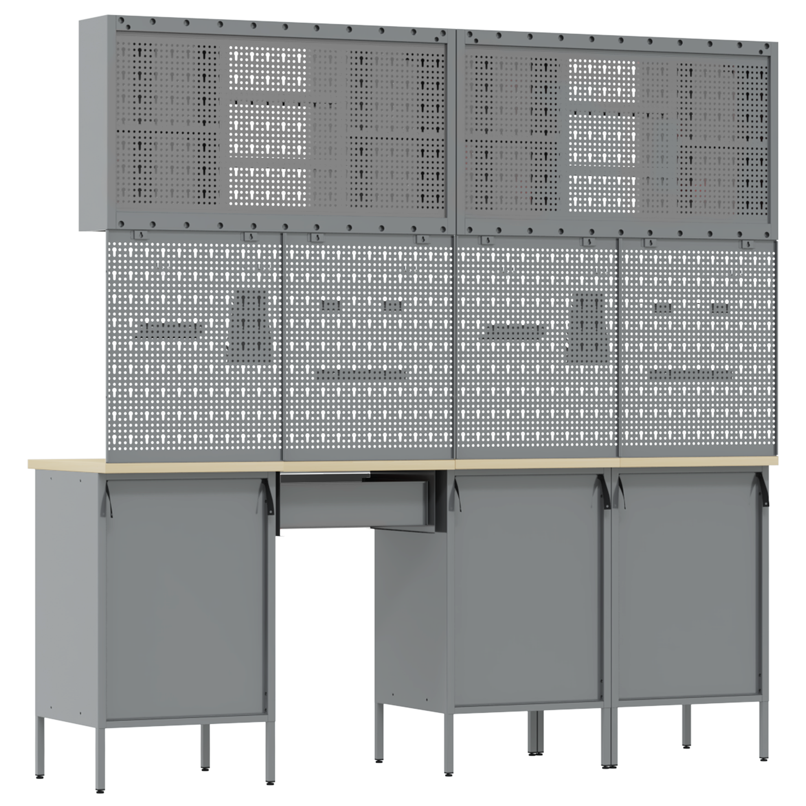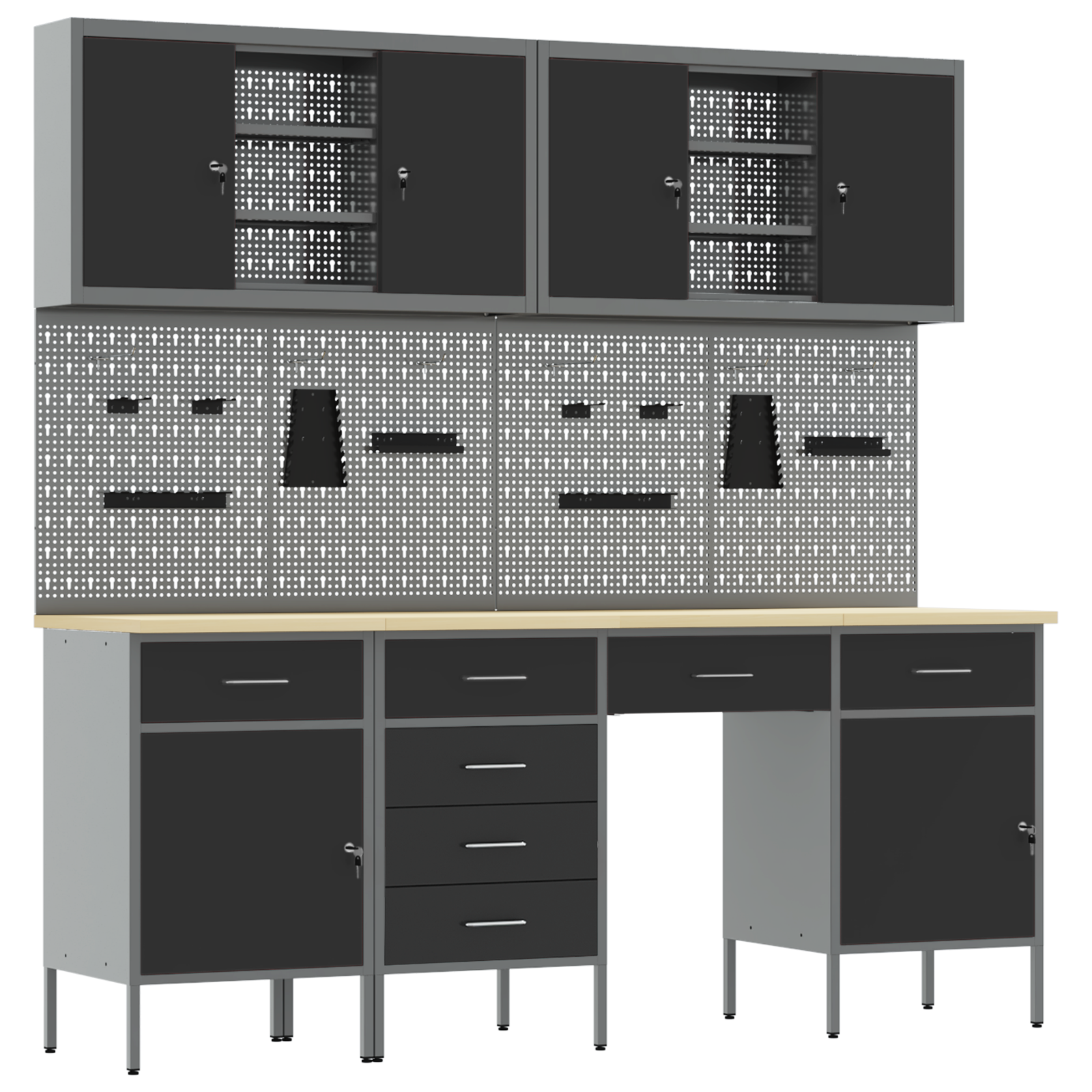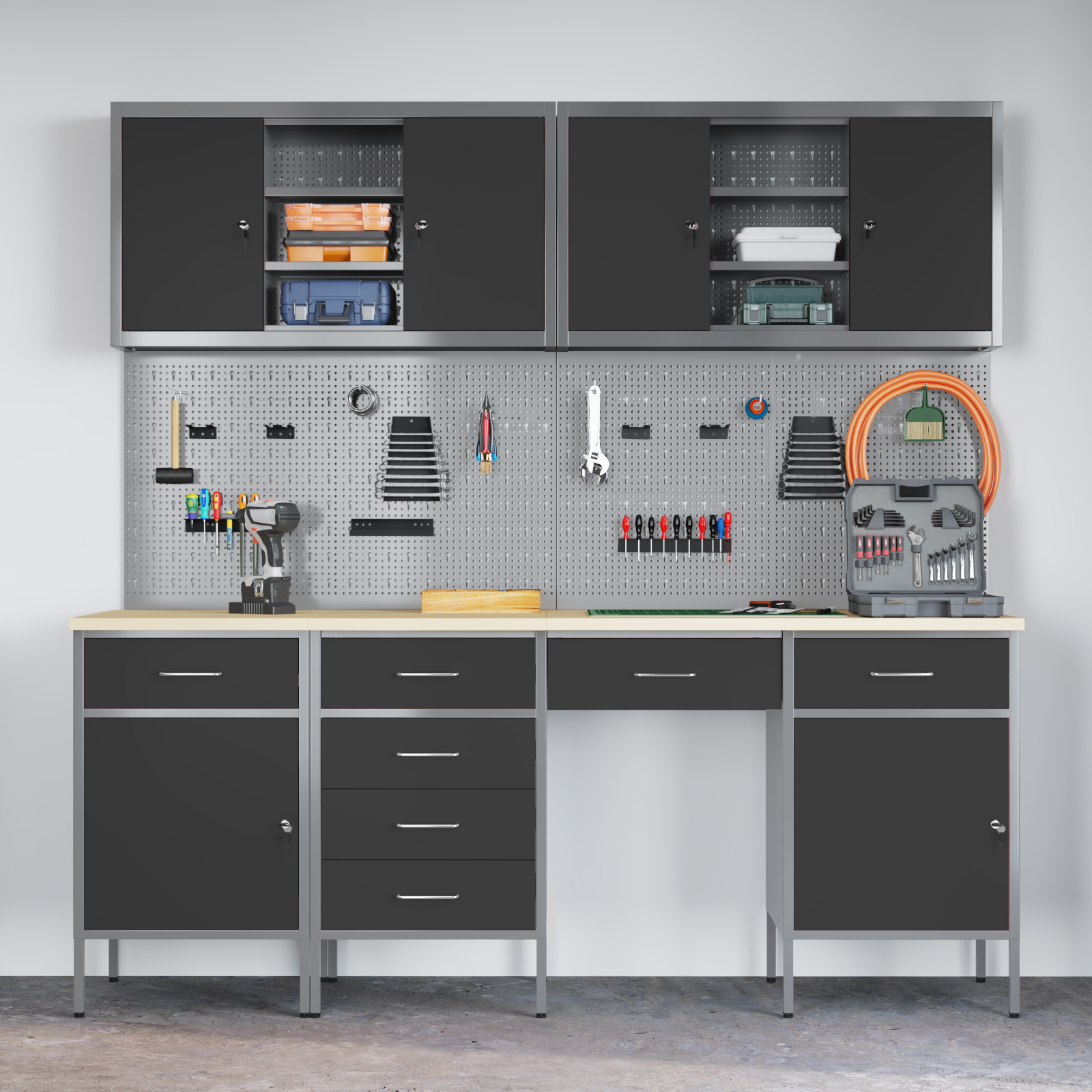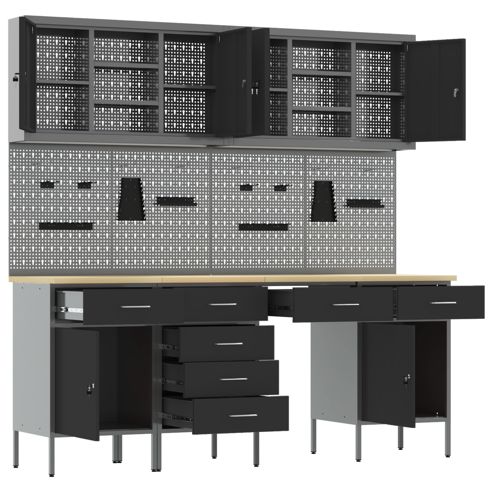 • Víceúčelové úložiště: Skříň má spoustu oddělení, šuplíků a polic, což nabízí skvělá organizační řešení. Efektivně uspořádá nástroje a materiály, což vám usnadní práci a zajistí, že všechno bude na místě. Jejím chytrým designem vyhovíte různým potřebám, od velkých nástrojů po malá příslušenství, takže je nepostradatelná pro uspořádané pracovní prostory.