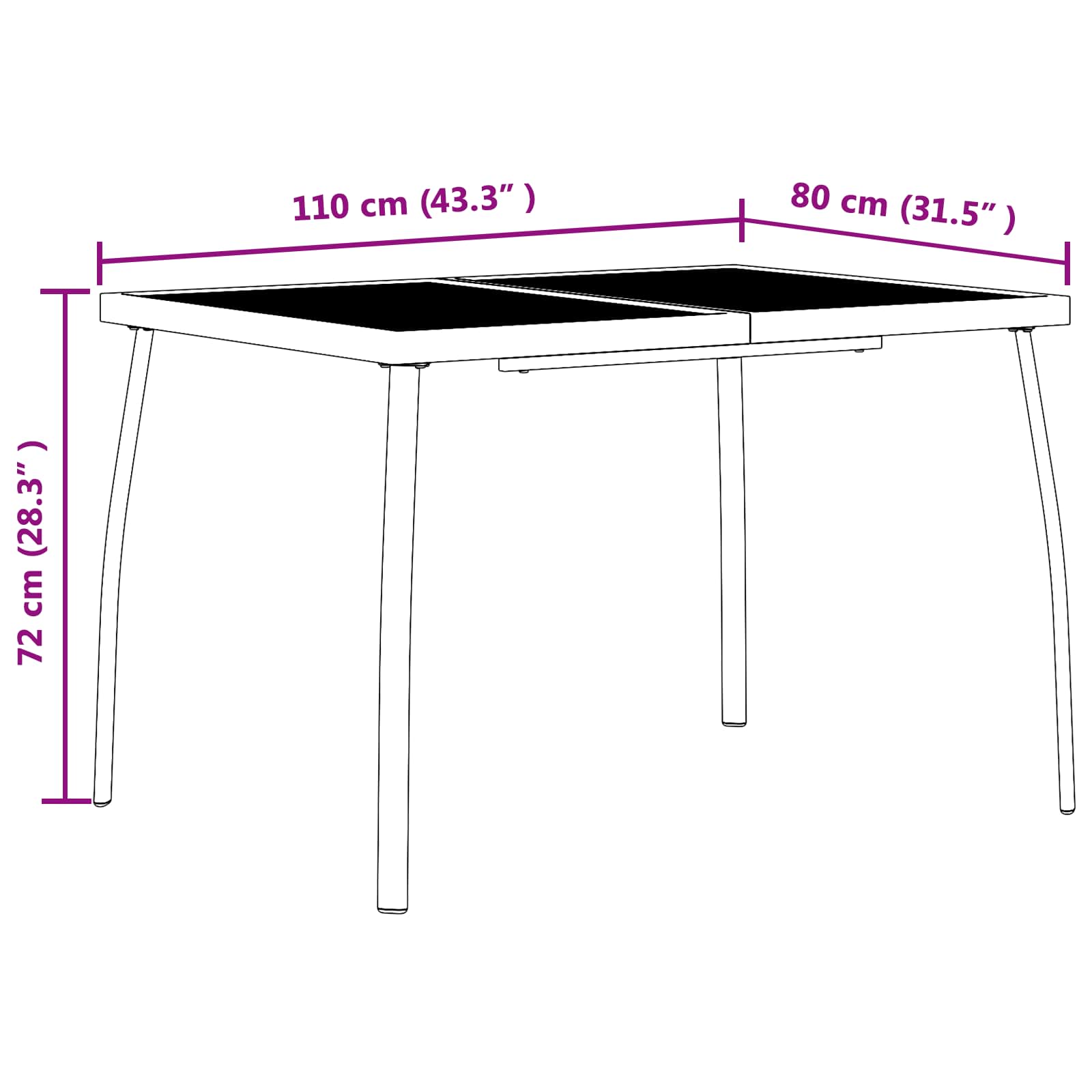 • 1 x síťový stůl: 110 x 80 x 72 cm (D x Š x V)