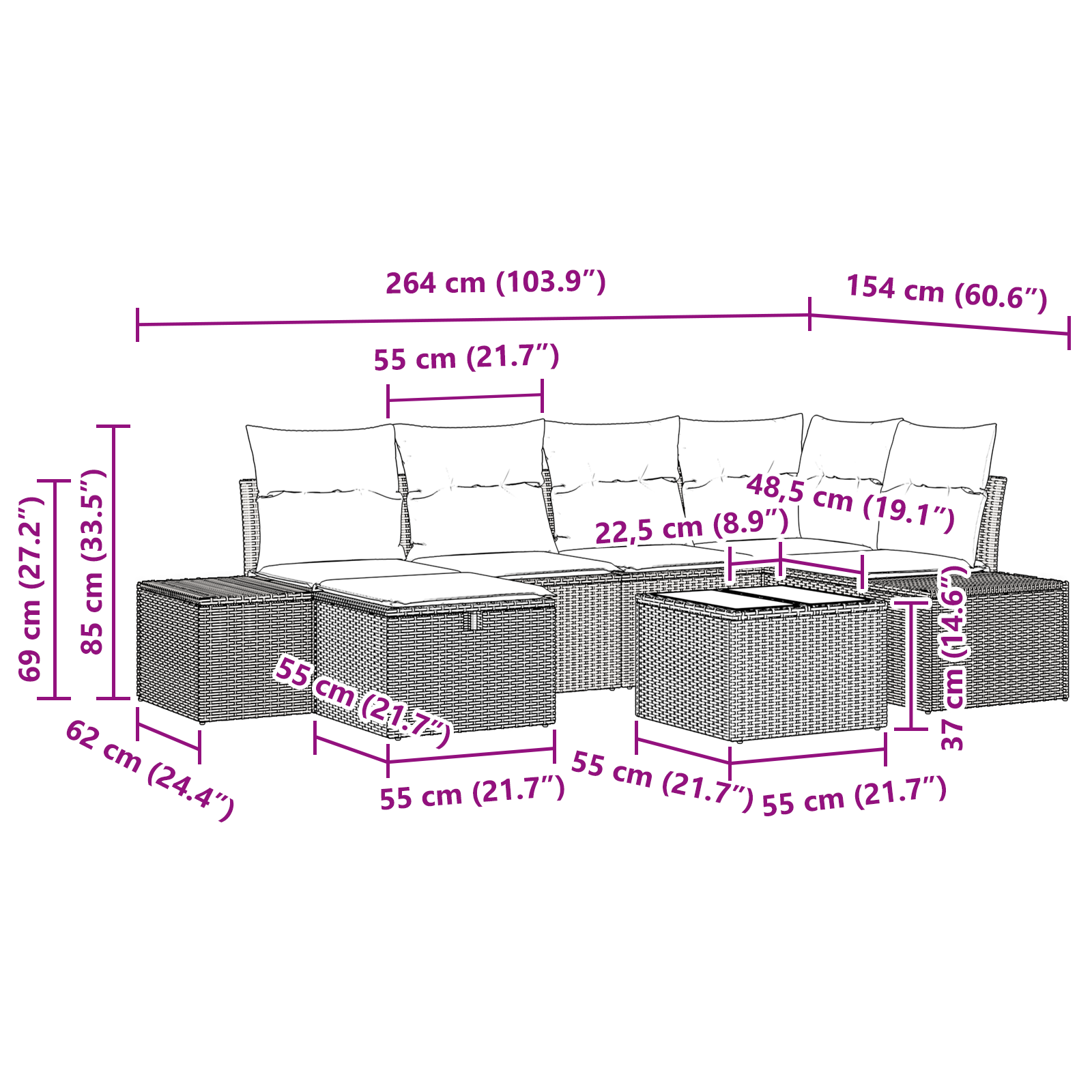 Tato moderní zahradní sedací souprava nesmí chybět na vaší terase nebo v zahradě. Je to flexibilní a stylový nábytek, který oživí vaše venkovní prostory. Spojuje funkčnost s minimalistickým vzhledem, takže ji snadno sladíte s jakýmikoliv dekoracemi. Vy si můžete upravit uspořádání podle svých potřeb, což ji činí ideální nejen pro společenské akce, ale i pro soukromé relaxační chvíle.