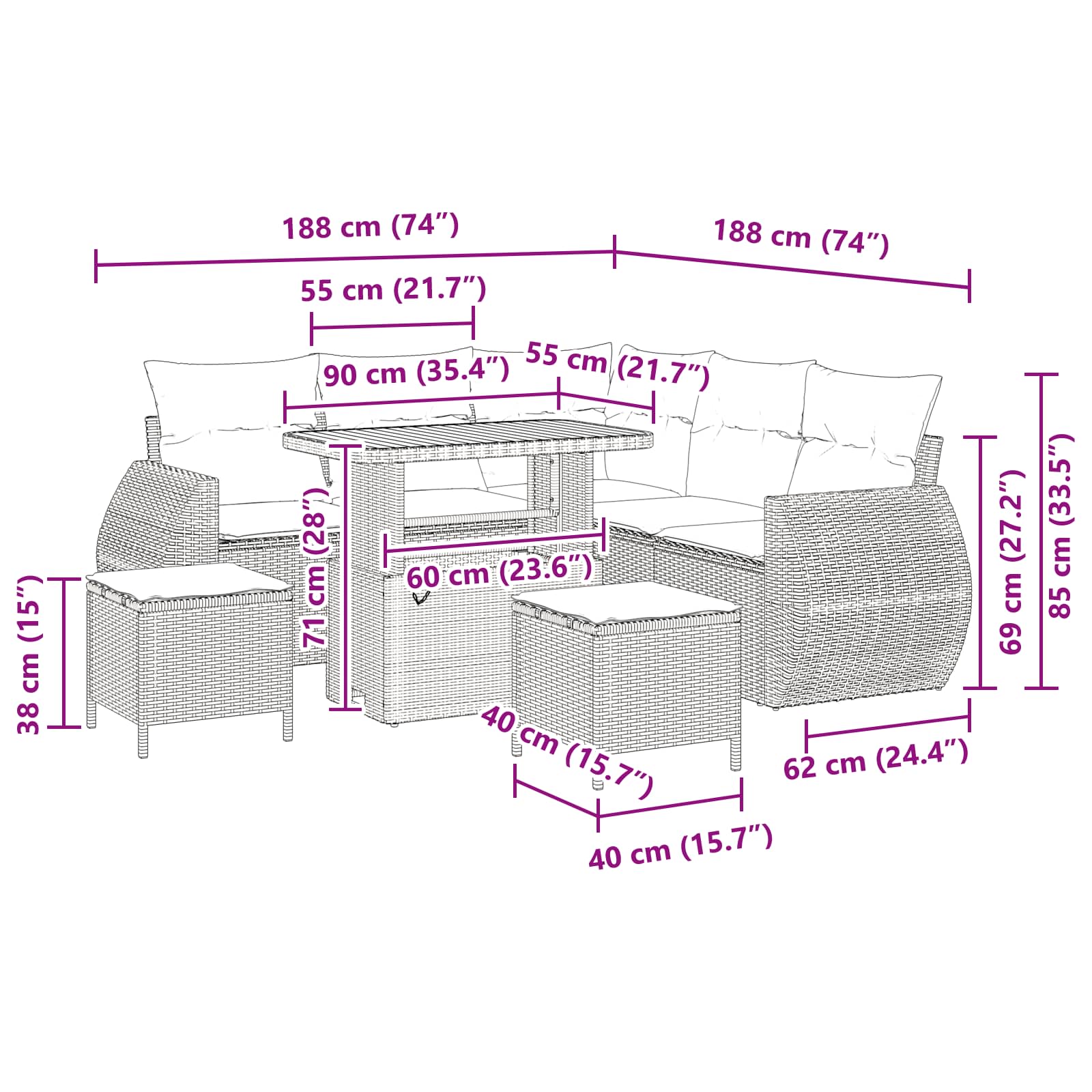 Tato modulární zahradní pohovková souprava je super flexibilní a hodí se na slunné terasy i do rušných zahrad. Moderní design zaručuje pohodlný a stylový prostor pro relaxaci a schůzky venku. Ideální pro venkovní posezení, kde si můžete užívat slunečné počasí.