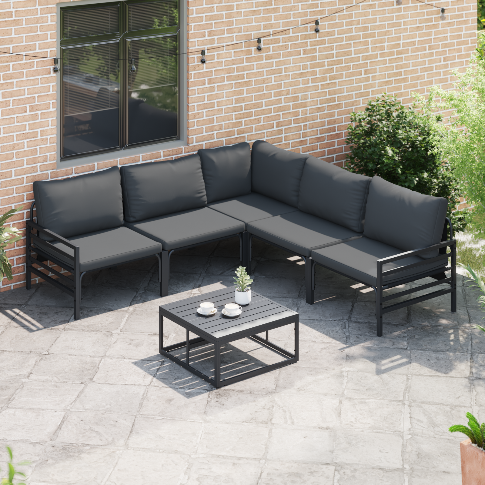 Tato moderní zahradní sedačková souprava je skvělou volbou pro venkovní prostory. Její elegantní design a minimalistický styl dodají šmrnc každému prostředí. Ideální pro odpočinek s rodinou a přáteli, nabízí pohodlí a funkčnost. Hladký černý povrch se snadno začlení do různých exteriérů, což z ní dělá dokonalé místo pro setkání nebo relaxaci. S příjemným sezením a odolnou konstrukcí zaručuje skvělý zážitek venku.