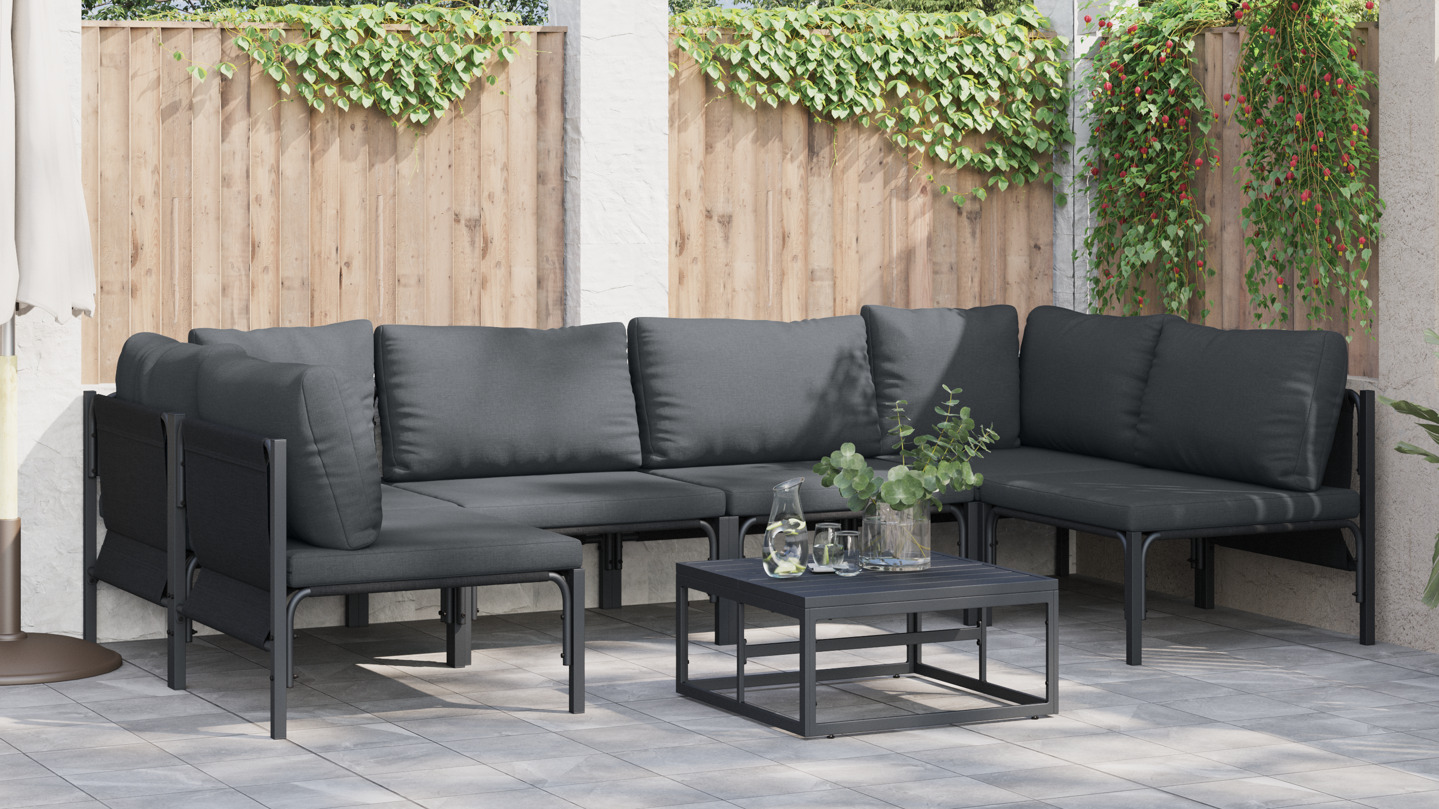 Tento moderní zahradní set pohovek je navrhnutý pro pohodlí a odolnost, čímž zkrášluje váš venkovní prostor s elegantním a moderním stylem. S čistými liniemi se bezproblémově spojuje funkčnost se stylem. Hodí se na zahradní terasy a dvory, vyzývá k relaxaci a setkání s přáteli jako příjemná vizuální přidaná hodnota. Prodyšná konstrukce a pohodlná sedadla zajišťují vítanou atmosféru pro dlouhé povídání nebo klidné rozjímání na čerstvém vzduchu.