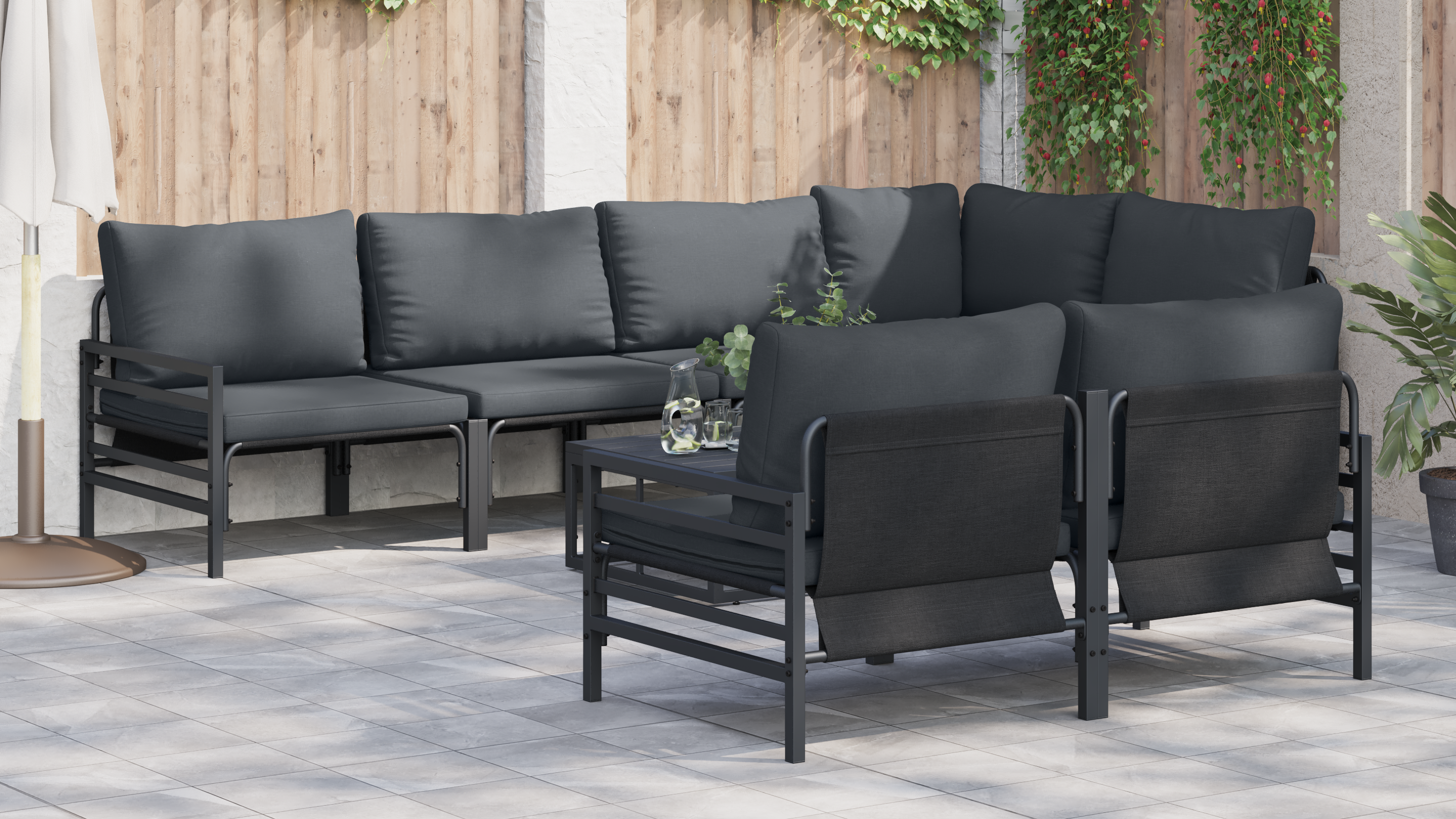 Tento moderní zahradní sofa set je skvělým doplňkem pro každý venkovní prostor, navržený pro ty, kteří hledají styl a praktičnost. Mít čisté linie a minimální zdobení, hezky doplňuje každou zahradu nebo terasu. Elegantní design vybízí k relaxaci a společenským chvílím, tvoří příjemnou atmosféru pro rodinu a přátele. Ať už děláš grilovačku v létě nebo si chceš užít klidný večer pod hvězdami, tento set ti nabídne luxusní, ale praktické sezení.