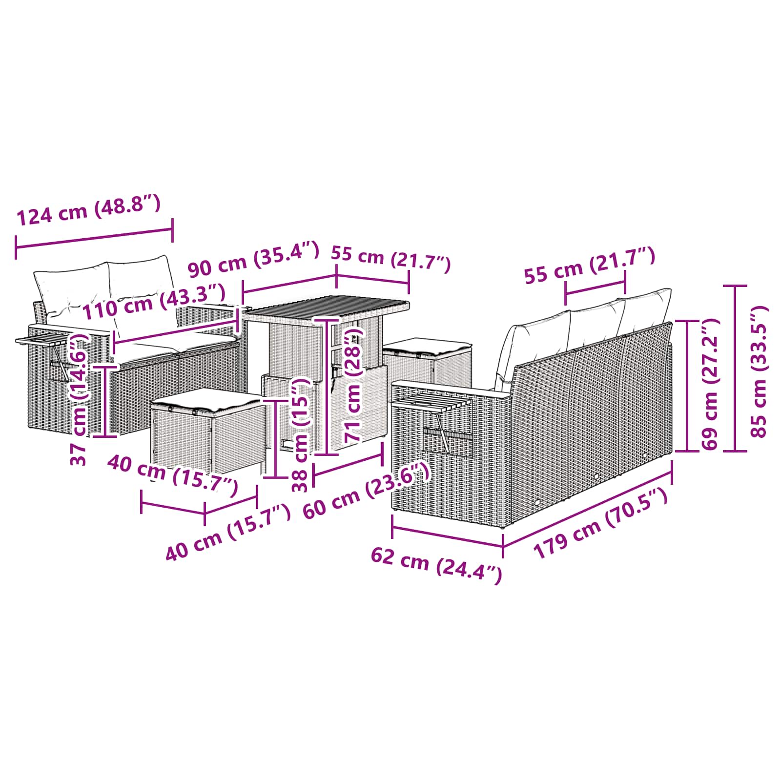 Tato moderní zahradní pohovková sada je vysoce funkční a skvěle se hodí pro všechny, kteří mají rádi současný styl s jednoduchými liniemi. Je určena do zahrad a na terasy a dodává elegantní atmosféru, která ladí jak s moderním, tak minimalistickým venkovním prostředím, což z ní dělá ideální volbu pro jarní a letní sezení.