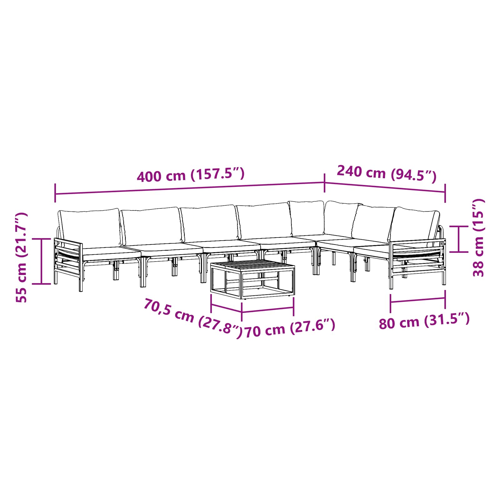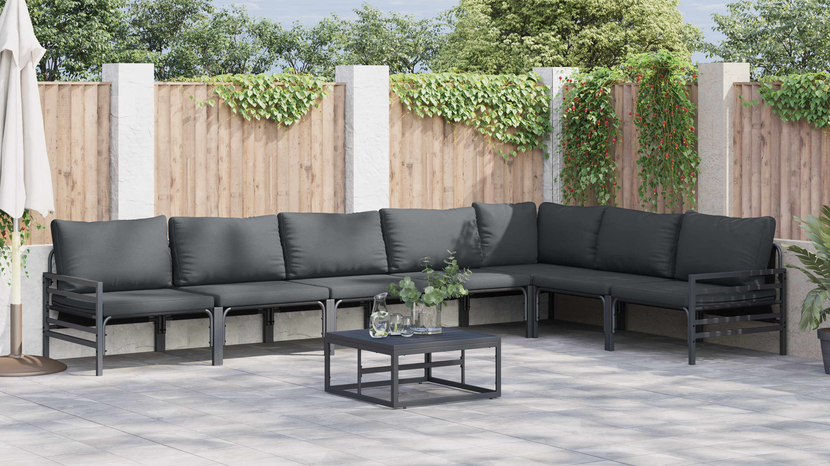 Tato moderní souprava pro venkovní sezení promění vaše prostory díky elegantnímu a funkčnímu designu, který je skvělý pro zahrady a terasy. S čistými liniemi a minimalistickým stylem nabízí dostatek místa pro slunečné jarní a letní dny, zajišťující pohodlné posezení pro vás a vaše hosty. Perfektní pro ty, kdo mají rádi moderní estetiku, tato souprava snadno zapadne do současného životního stylu a poskytne skvělé pozadí pro relaxaci nebo oslavy.