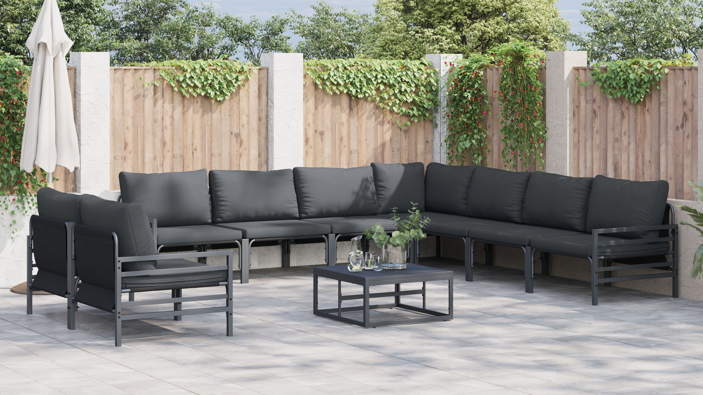 Tahle moderní zahradní pohovka ukazuje současný styl v kombinaci se šikovností a funkčností, ideální pro zahradu nebo terasu. Její elegantní design s čistými liniemi přináší moderní a minimalistické kouzlo, které sedí do venkovního prostředí. Odolává špatnému počasí a je perfektní pro rodinná setkání nebo příjemný odpočinek na sluníčku. Set je prostě elegantní, doladěný pohodlnými polštáři v krásné antracitové barvě, které zvou k odpočinku venku.