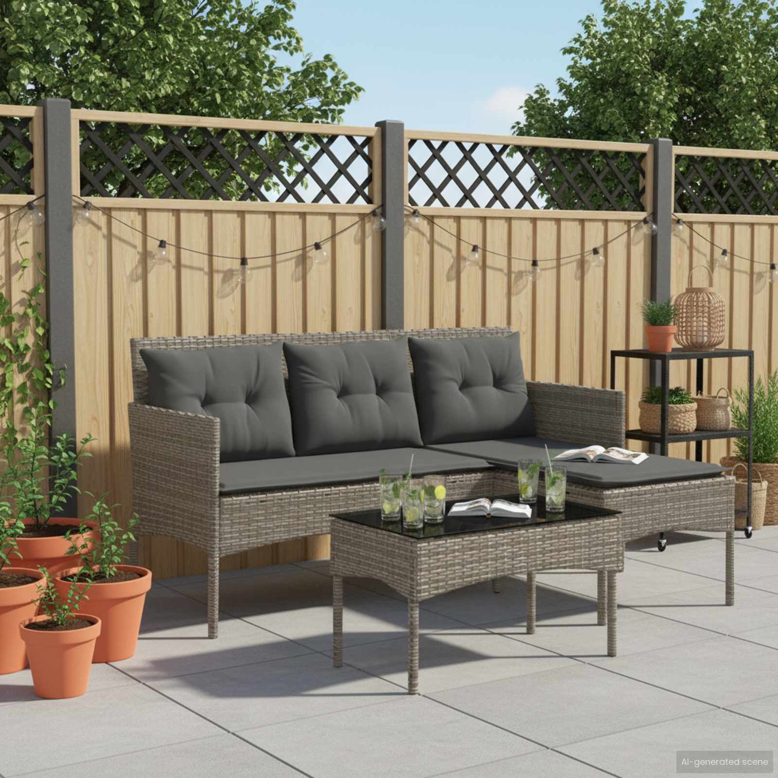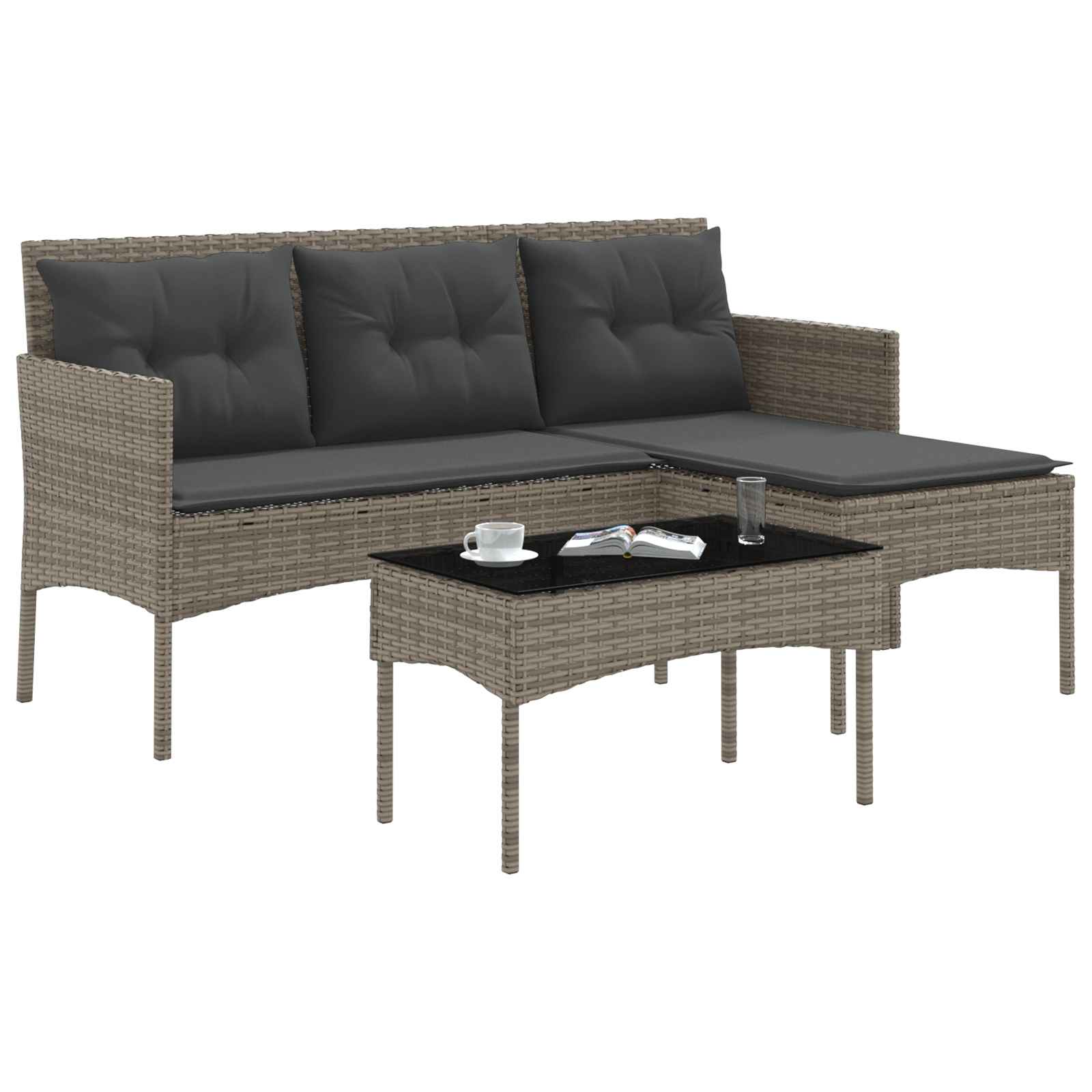 Tento moderní zahradní sofa set je navržen tak, aby přinesl pohodlí a styl do vašeho venkovního prostoru. S elegantními liniemi a minimalistickým designem promění každou zahradu nebo terasu na útulnější místo. Ideální jak pro setkání s přáteli, tak i na klidné lenošení o samotě, jeho L-čkový tvar z něj dělá multifunkční doplněk, který sedí do různých venkovních stylů. Kombinace funkčnosti a elegance je skvělá pro hostování nebo si užít chvíle klidu na čerstvém vzduchu, což z něj činí oblíbenou volbu pro moderní majitele domů, kteří hledají nadčasový styl.