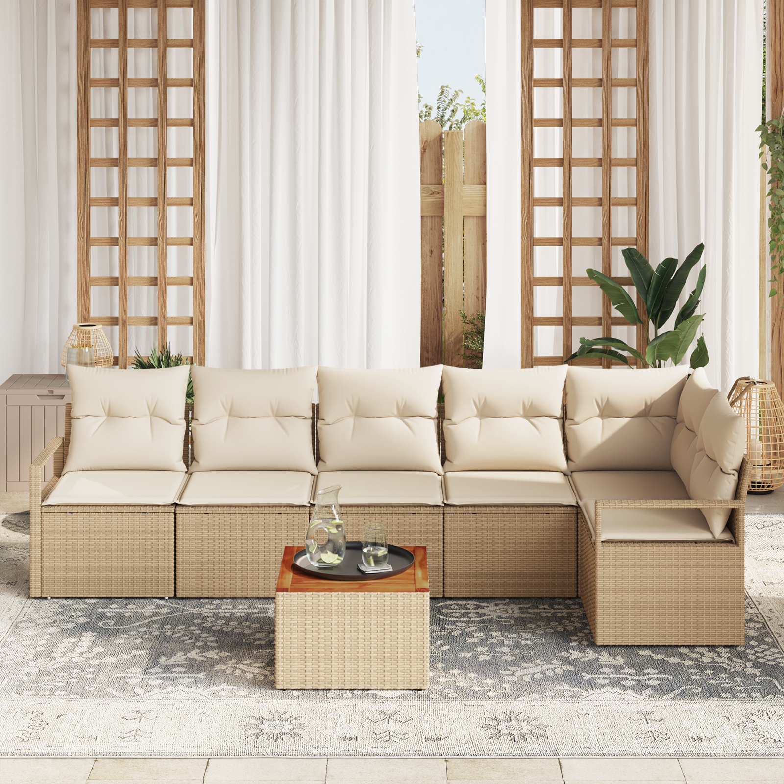 • Funkce /design: Tato souprava má UV-odolnost, což ji chrání před slunečním poškozením, takže si zachovává svůj přitažlivý vzhled po celou sezónu. Je lehká, takže se s ní jednoduše hýbe a přizpůsobuje se podle příležitosti. Modulární design ale umožňuje přizpůsobení nebo změnu uspořádání podle potřeby.