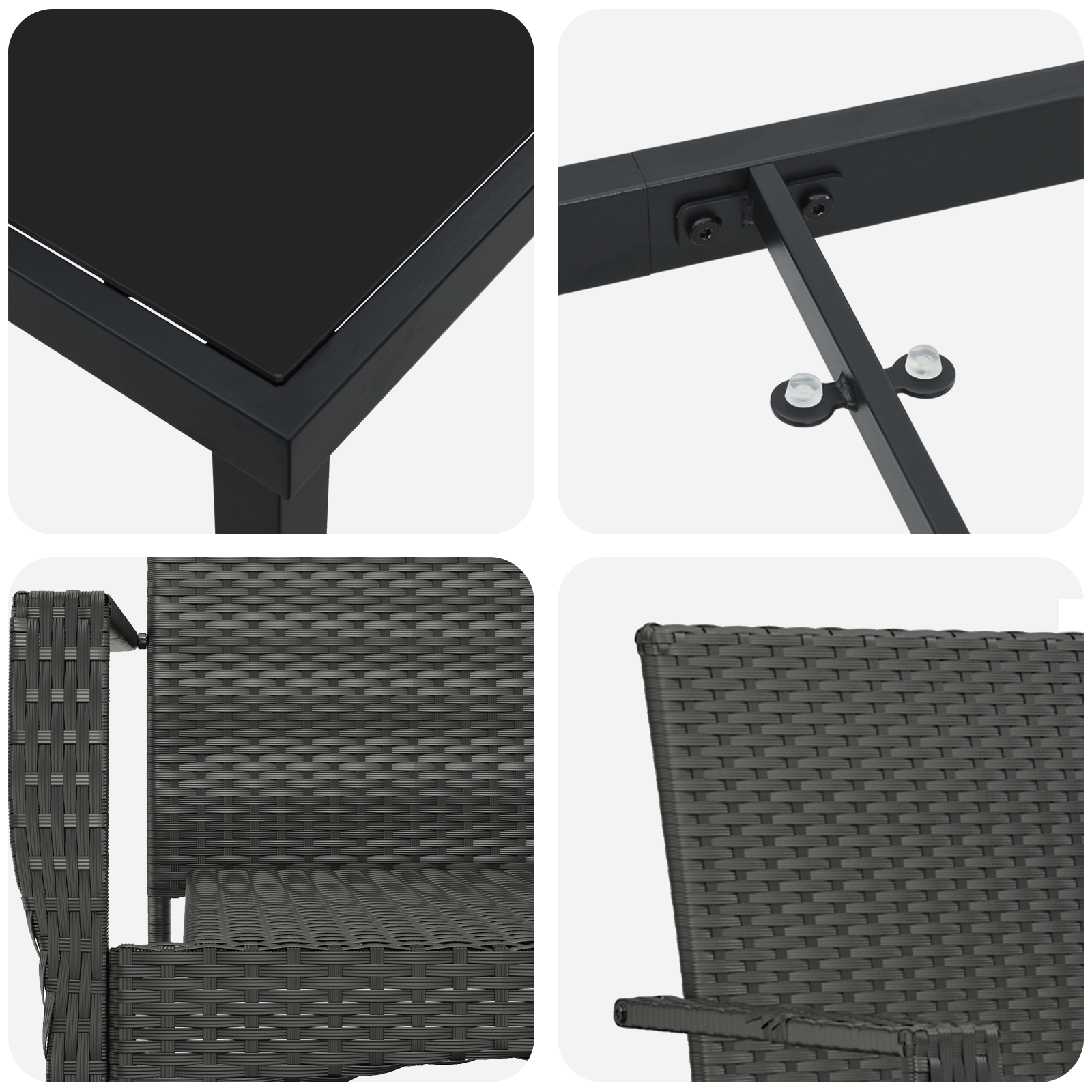 • Odolné materiály: Vyrobeno z odolného polyratanu a práškově lakované oceli. Tvrzené sklo dává stolu stylový vzhled a je připraveno na každodenní používání. Polyratanové křesla jsou pohodlná a nohy zajišťují stabilitu.
