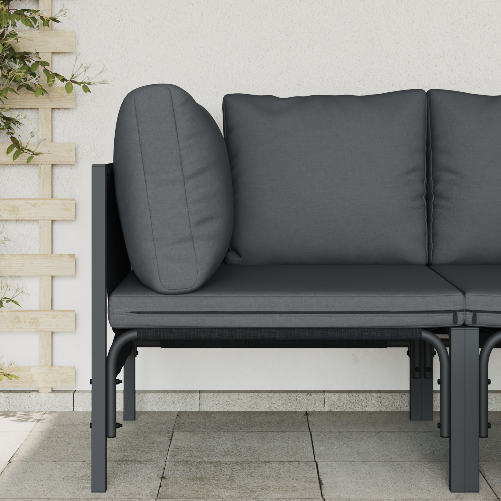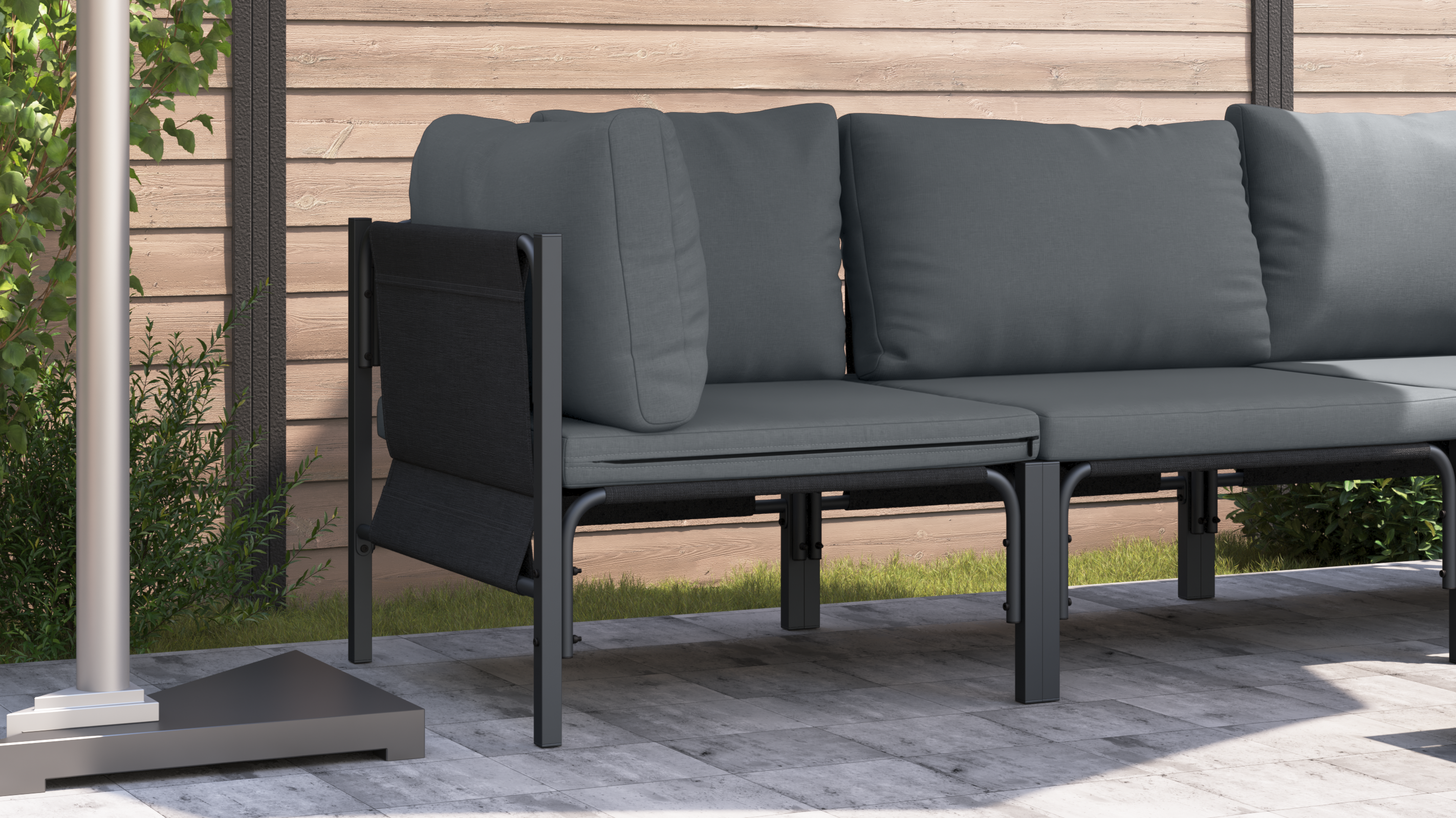Tato outdoorová sekční sedačka je super volba pro ty, co chtějí zkrášlit svou zahradu nebo terasu. Antracitové barvy dodávají elegance a slibují pohodové chvíle. S jednoduchým designem a elegantními liniemi je ideální na večerní posezení, společenské akce nebo klidné ráno v přírodě. Její kovová konstrukce je pevná a vypadá stylově, takže se hodí do různých prostorů. Promyšlený design přináší skvělou všestrannost pro jakýkoliv venkovní prostor.