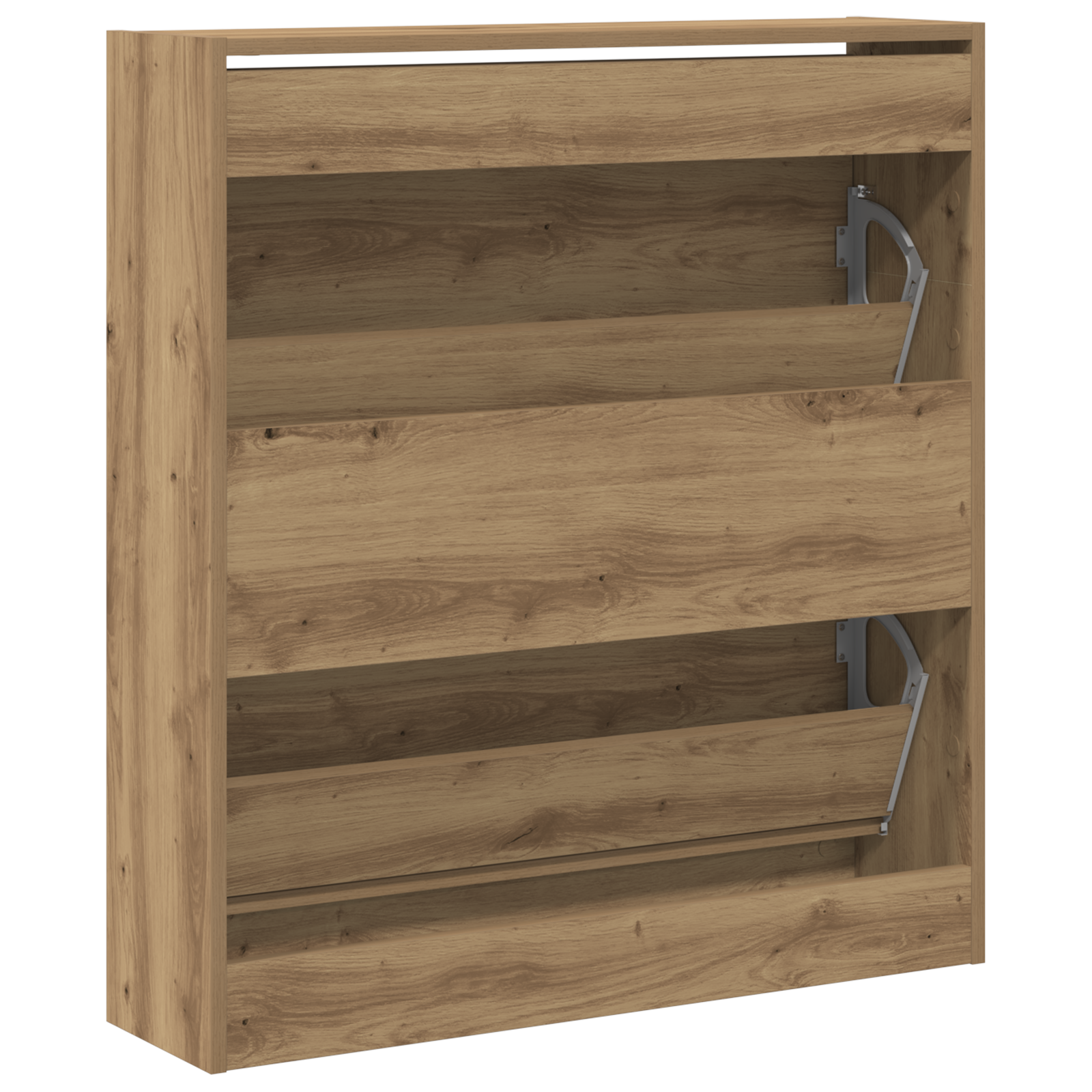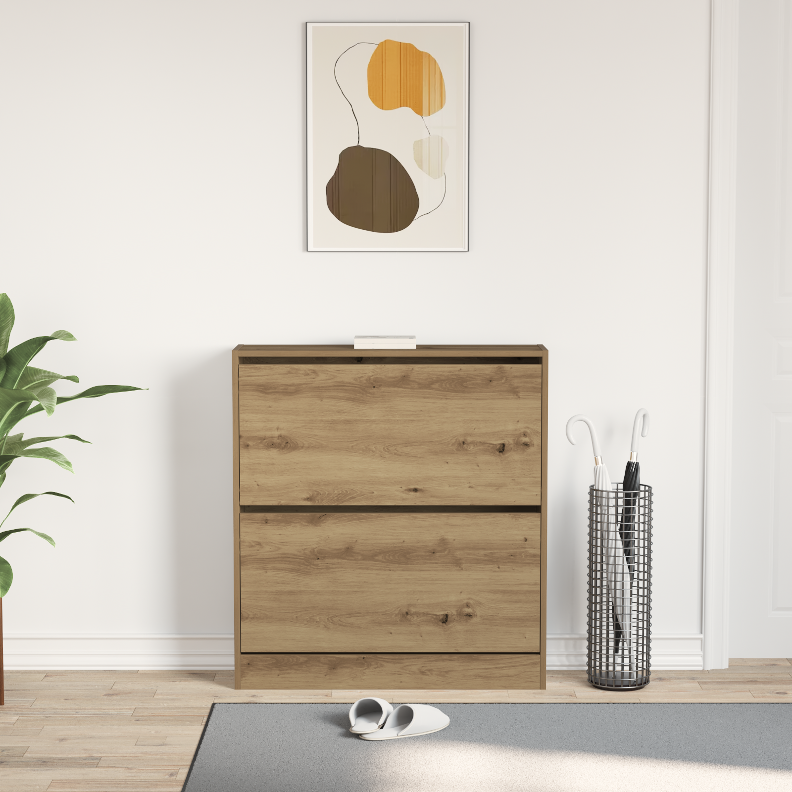 Tato moderní skříň na boty kombinuje funkčnost a design, takže je ideálním kouskem pro jakýkoliv obývák. Díky elegantnímu designu s čistými liniemi skvěle zapadá do moderních interiérů. Je vytvořená pro ukládání a organizaci obuvi, takže si udržíte přehled a pořádek. Konstrukce z inženýrského dřeva poskytuje odolné a vkusné úložiště pro boty, perfektní pro každého, kdo chce vnese do svého domova moderní akcent.