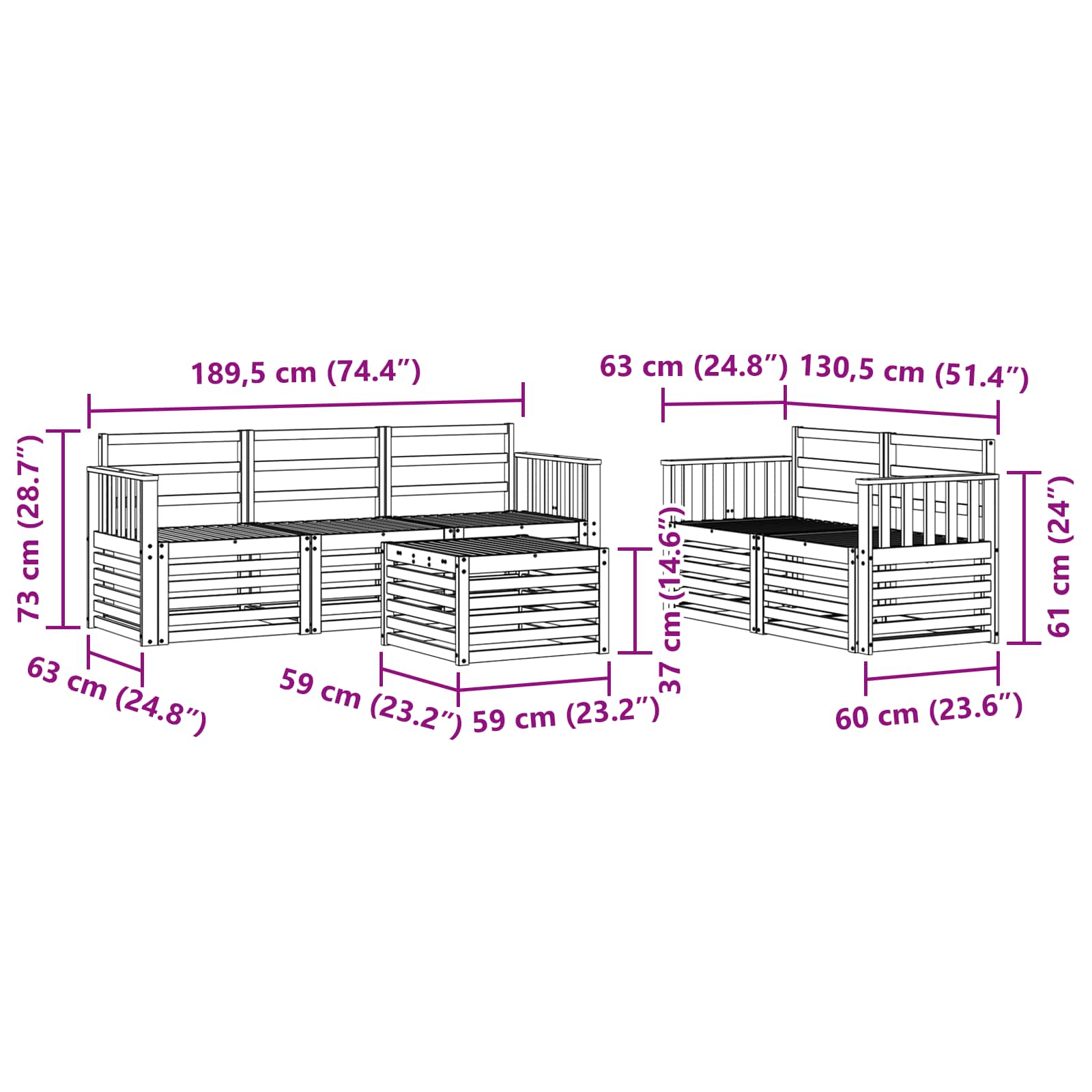• 5 x Střední pohovka: 63 x 59 x 73 cm (Dxlxvx)
