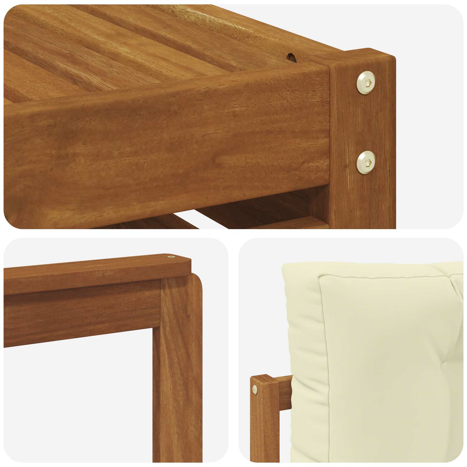 • Odolné masivní akáciové dřevo: V těhlech venkovních sedačkách je použitý masivní akáciový materiál, který je super pevný a snáší venkovní podmínky. Stabilní konstrukce poskytuje spolehlivou oporu a teplé přírodní tóny dodávají styl každé zahradě nebo terase.