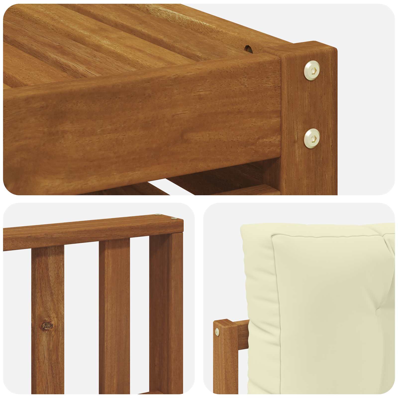 • Odolné masivní akáciové dřevo: V těhlech venkovních sedačkách je použitý masivní akáciový materiál, který je super pevný a snáší venkovní podmínky. Stabilní konstrukce poskytuje spolehlivou oporu a teplé přírodní tóny dodávají styl každé zahradě nebo terase.