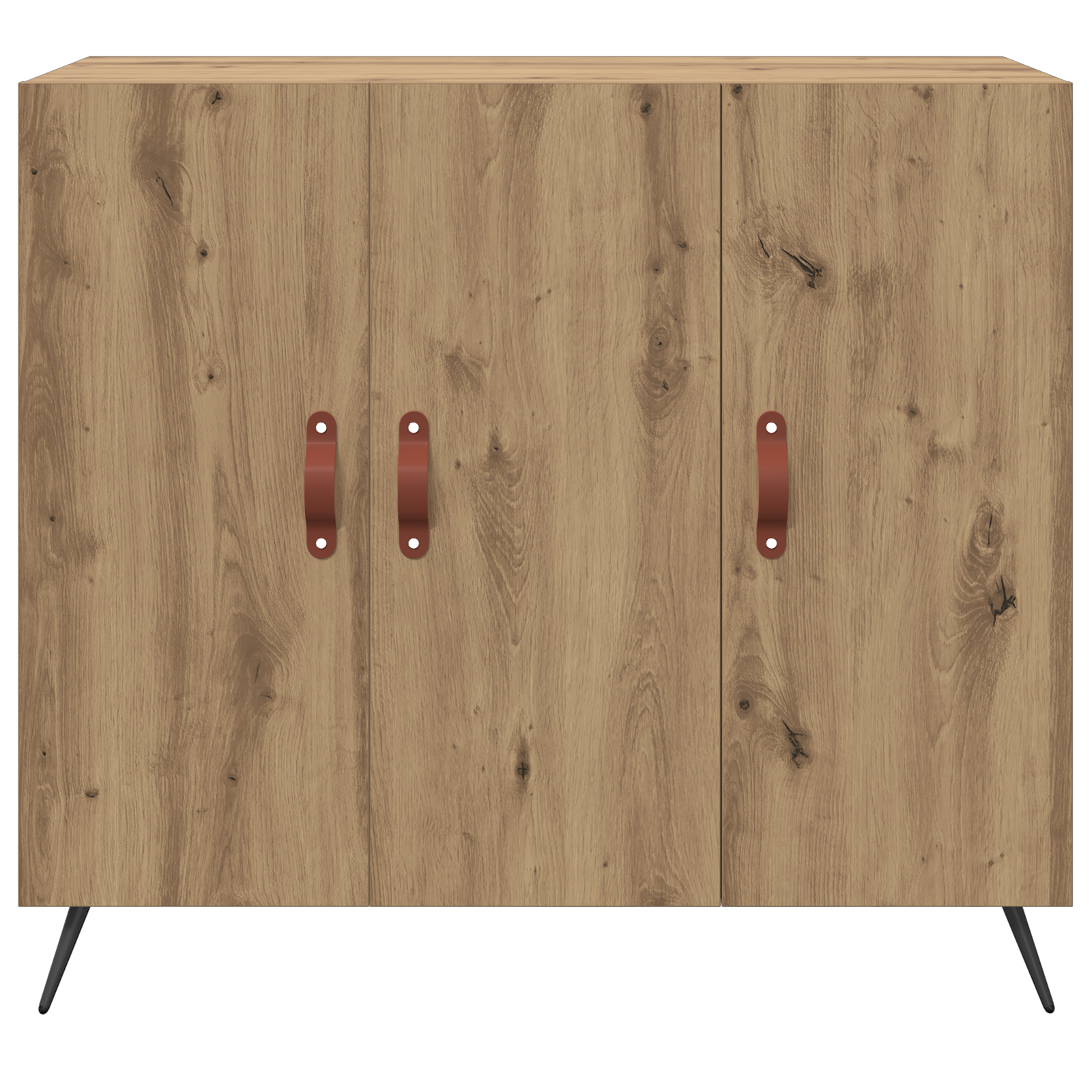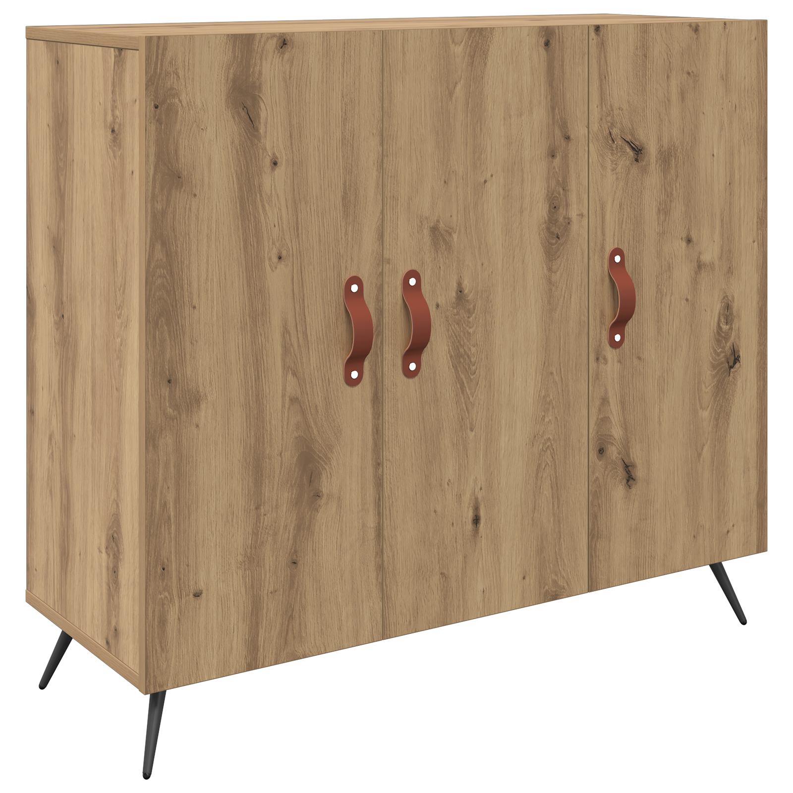 • Složení věcí: Má dveře na pantech s koženými úchyty, které dodávají teplý a příjemný dojem. Kuželové nožky zajišťují stabilní základnu a dotvářejí moderní vzhled. Tato kombinace skvěle funguje a dává bohatý styl a užitečnost, což usnadňuje každodenní skladování.