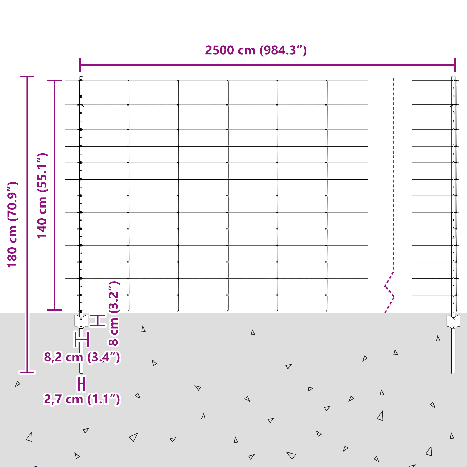• Celkové rozměry: 2500 x 2,7 x 140 cm (D x Š x V)