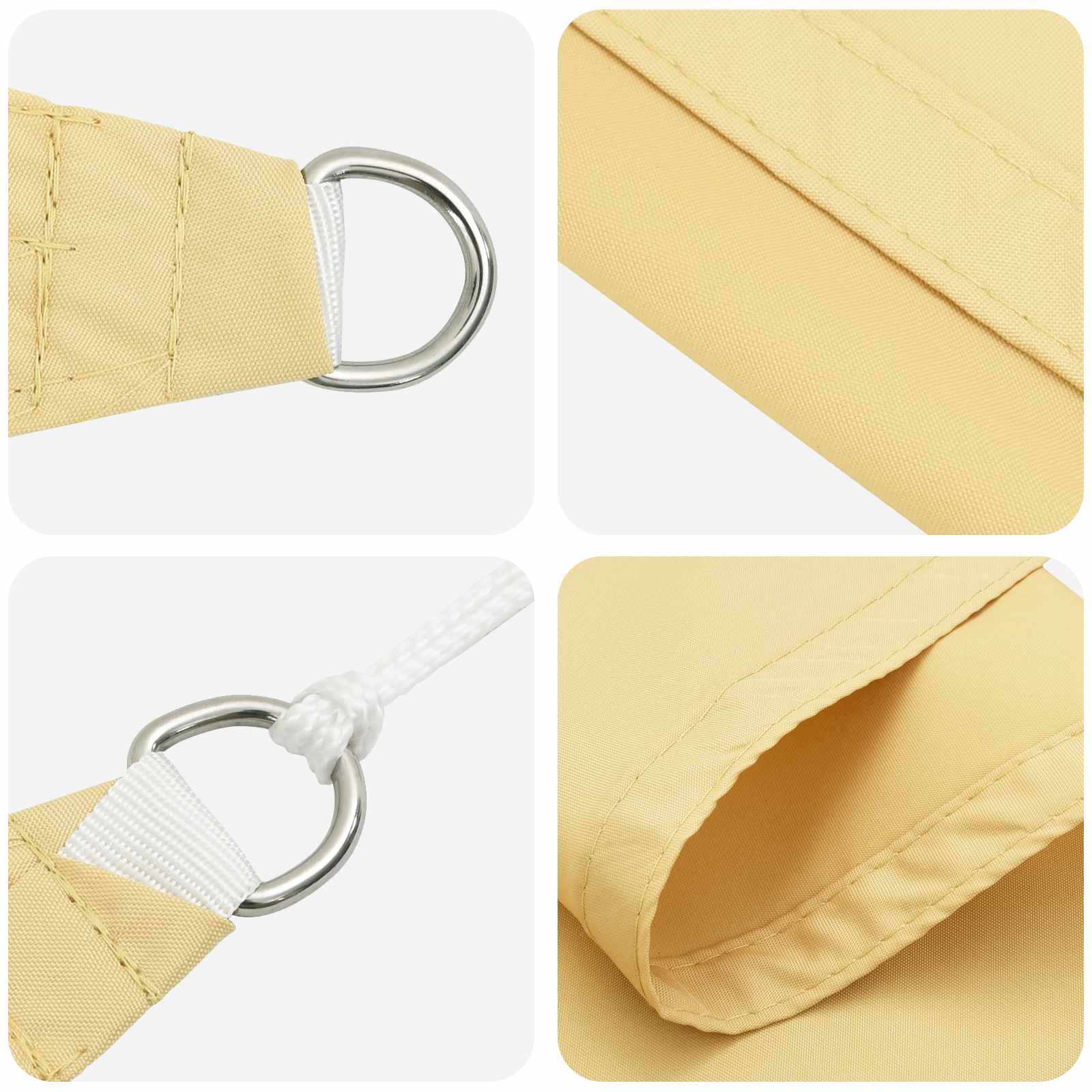 Tato sluneční plachta je z polyesterového oxfordu, což dává funkční zastínění venku. Je navržená tak, aby odolávala UV záření a vodě, takže je skvělá na terasy, zahrady nebo k bazénům. Konstrukce je zpevněna a rohy mají nerezové D-kroužky pro bezpečné uchycení. Tento lehký materiál se snadno montuje s přiloženými lany a snadno se skládá pro skladování. Je to praktické řešení jak chránit před sluncem a větrem na terasách, balkonech, nebo zahradách.