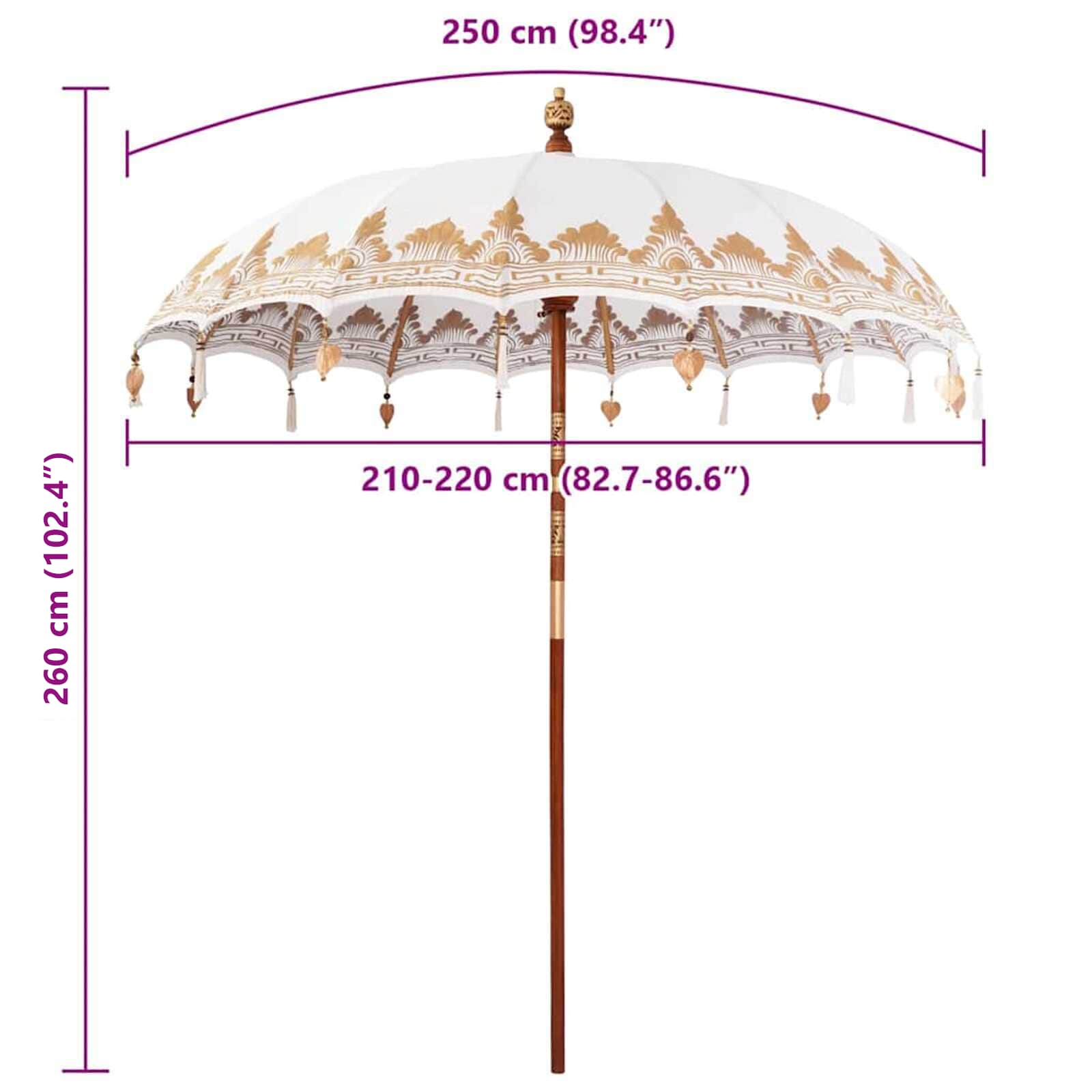 Balijský deštník je jedinečný kousek, který vaší zahradě nebo terase přináší exotickou eleganci. Tento slunečník má krásný kulatý baldachýn z bavlny a ručně šité detaily, které ho dělají ještě zvláštnějším. Je ideální pro letní akce—výborně vytváří uvolněnou tropickou atmosféru a poskytuje dobrý stín díky svému velkému průměru. Jeho balijský styl dává přirozený vzhled, úžasný pro venkovní stolování nebo lenošení pod tímto atraktivním slunečníkem.