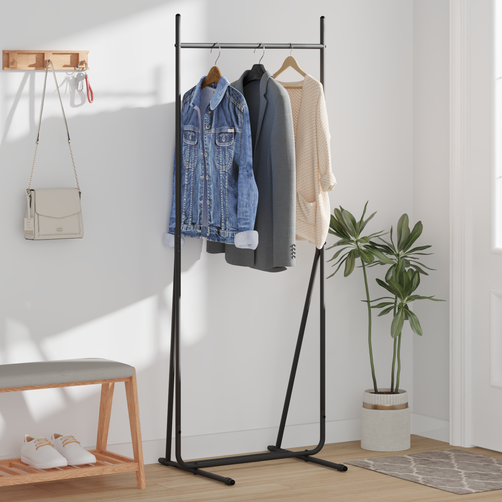 Tenhle moderní věšák na oblečení je parádním doplňkem do jakéhokoli pokojíčku. Spojuje úložný prostor se stylovou prezentací oblečení a doplňků. Minimalistický rám z odolné oceli a elegantní černá barva skvěle zapadne do moderních i industriálních interiérů. Obdélníkový design maximalizuje prostor bez zbytečného kompromisu, splňuje estetické i praktické potřeby tvého pokoje.