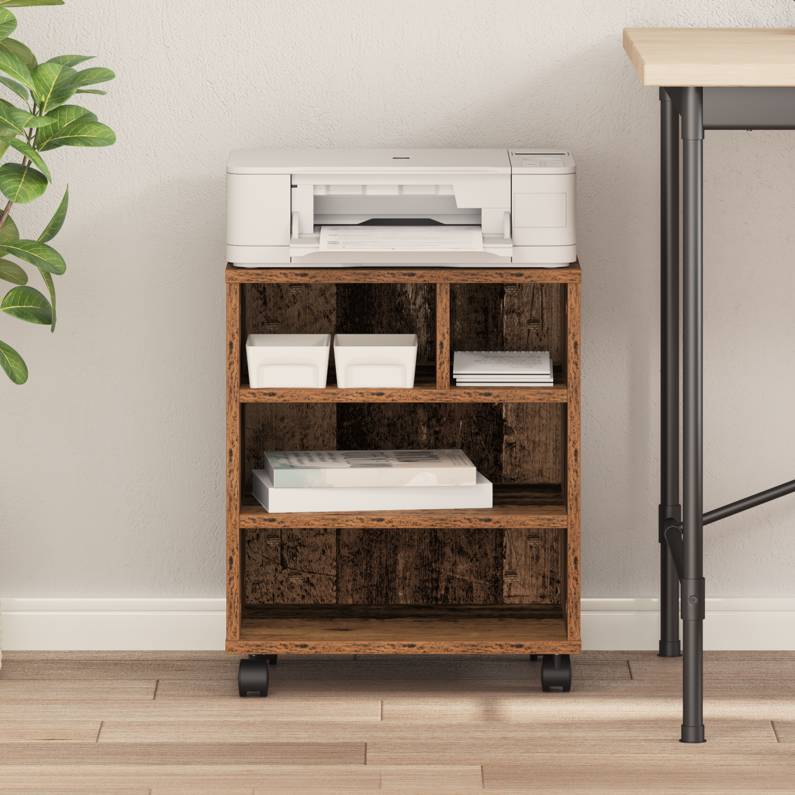 Tahle police na tiskárnu má rustikální vzhled, který podtrhuje její přirozené kouzlo, a je skvělým doplňkem do jakékoli kanceláře nebo domova. Je vyrobená z kompozitního dřeva a cítíš z ní příjemný a vřelý pocit. Design spojí funkčnost a styl, a praktické využití je na prvním místě. Ať už stojí v malém rohu kanceláře nebo v sdíleném pracovním prostoru, udrží tiskárny po ruce, takže můžeš efektivně pracovat, a zároveň ladí s tvým dekorem.