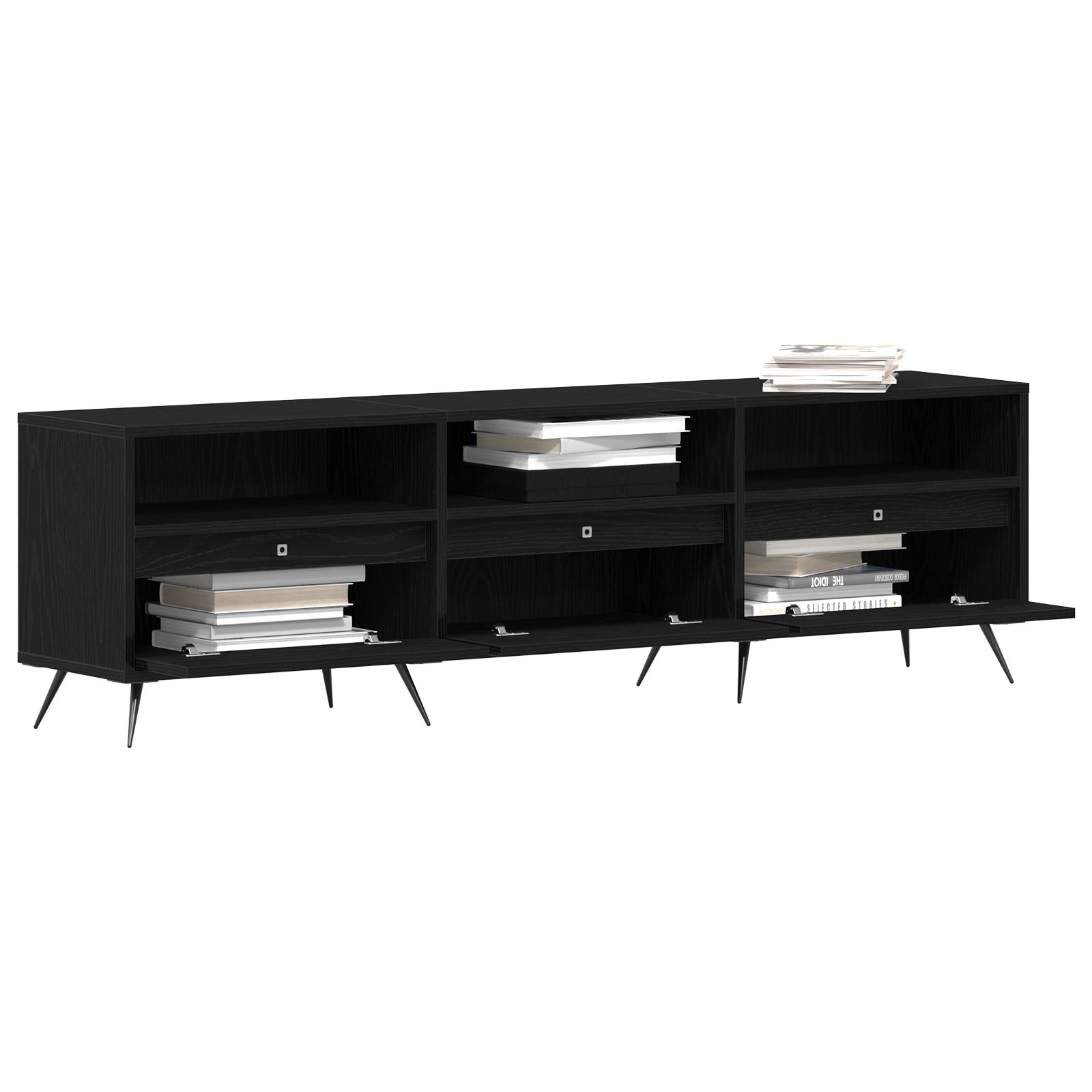 • Účinné úložiště: Skvěle navržené police pro ukládání všech médií na jednom místě. Můžete tam snadno vystavit dekorace nebo elektroniku, takže povrchy zůstanou čisté a uspořádané.